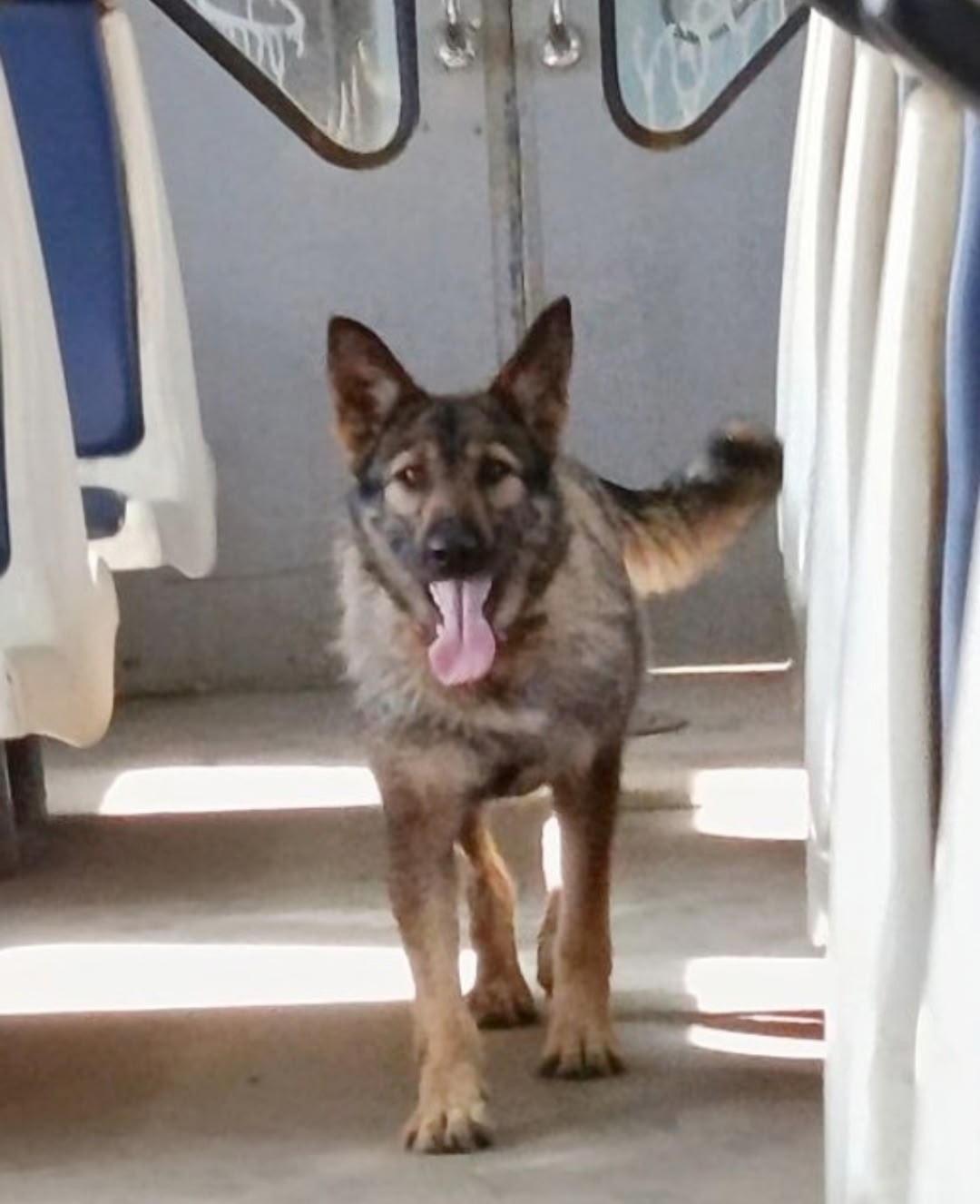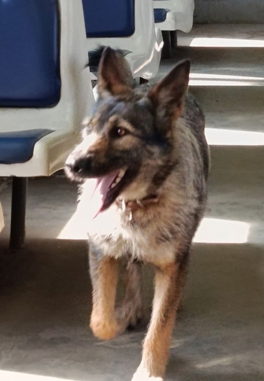 26.03. Окрас зонарно- рыжий, короткошерстная, ж/шерсть лежит в виде гривы на холке, уши стоячие. Бегала в вагоне электрички в 11:36 ст. Семхоз (Сергиев - Посад - Москва) Очень умная в бордовом ошейнике.