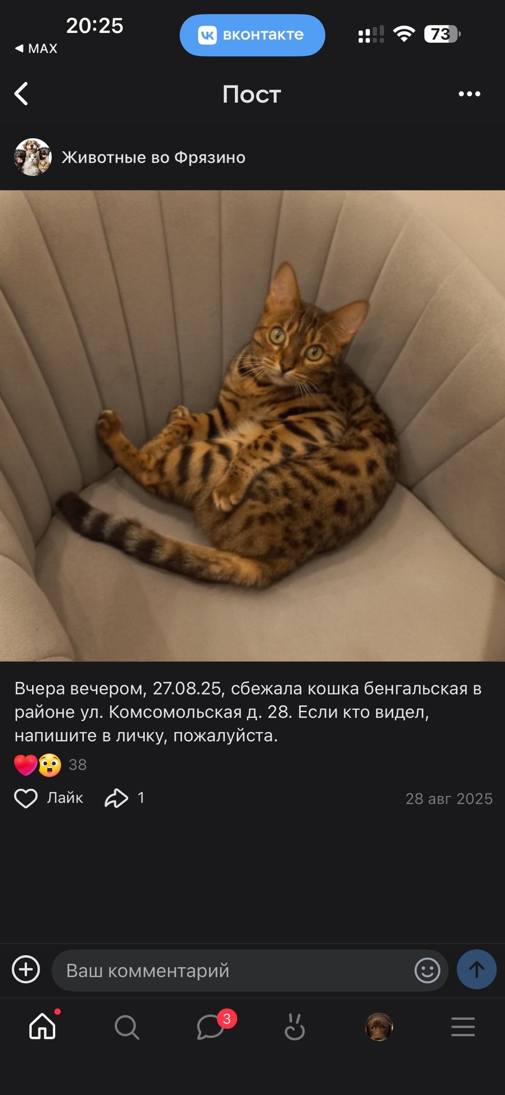 В августе месяце 2025 года был пост в группе,что потерялась похожая кошка,может это она?