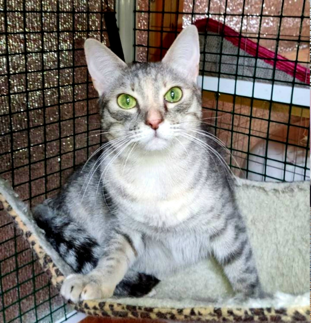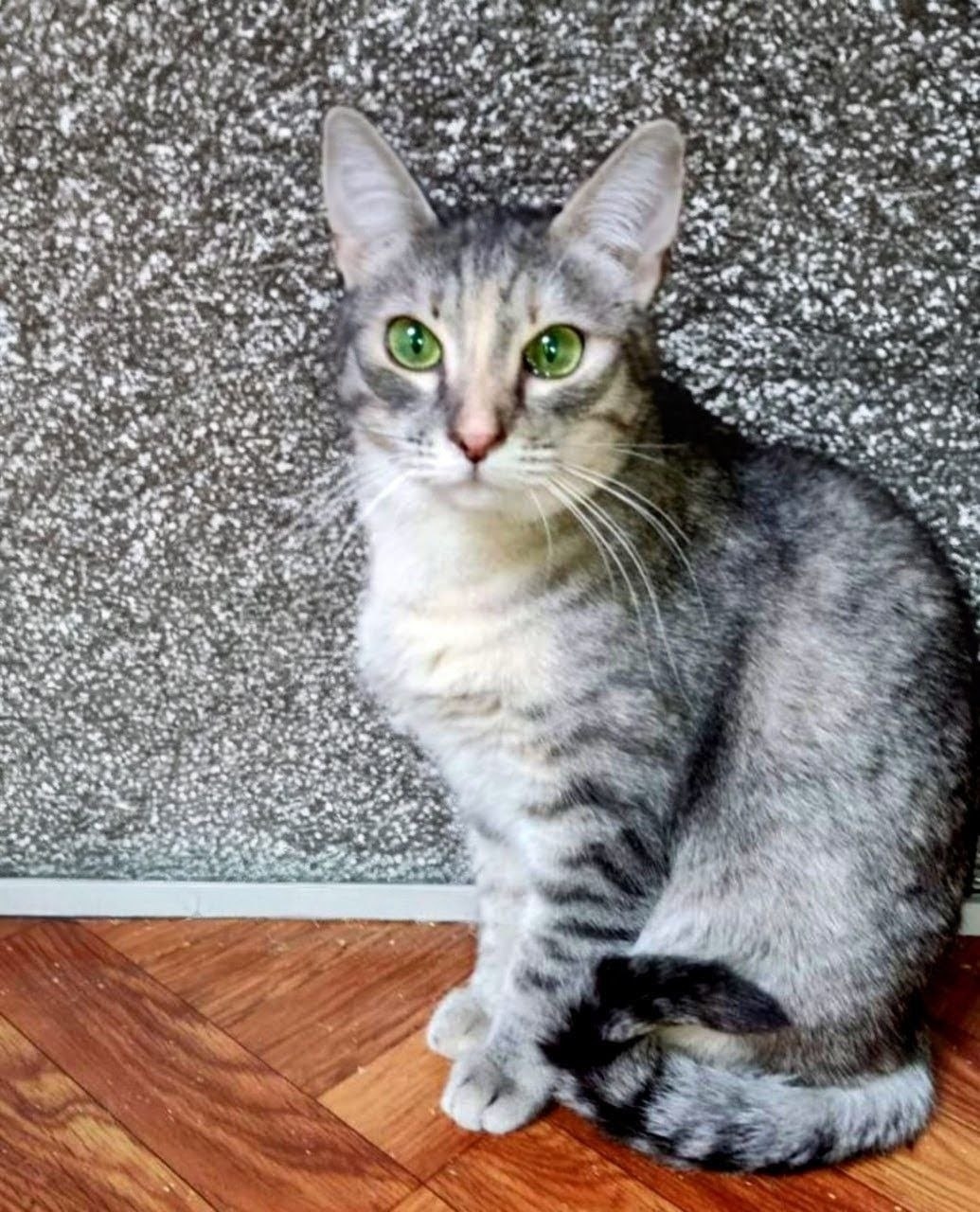 Окрас полосатый, светло-серый, с вкраплениями мелких рыжих пятен (голубокремовый). На носу светло-рыжая полоска.