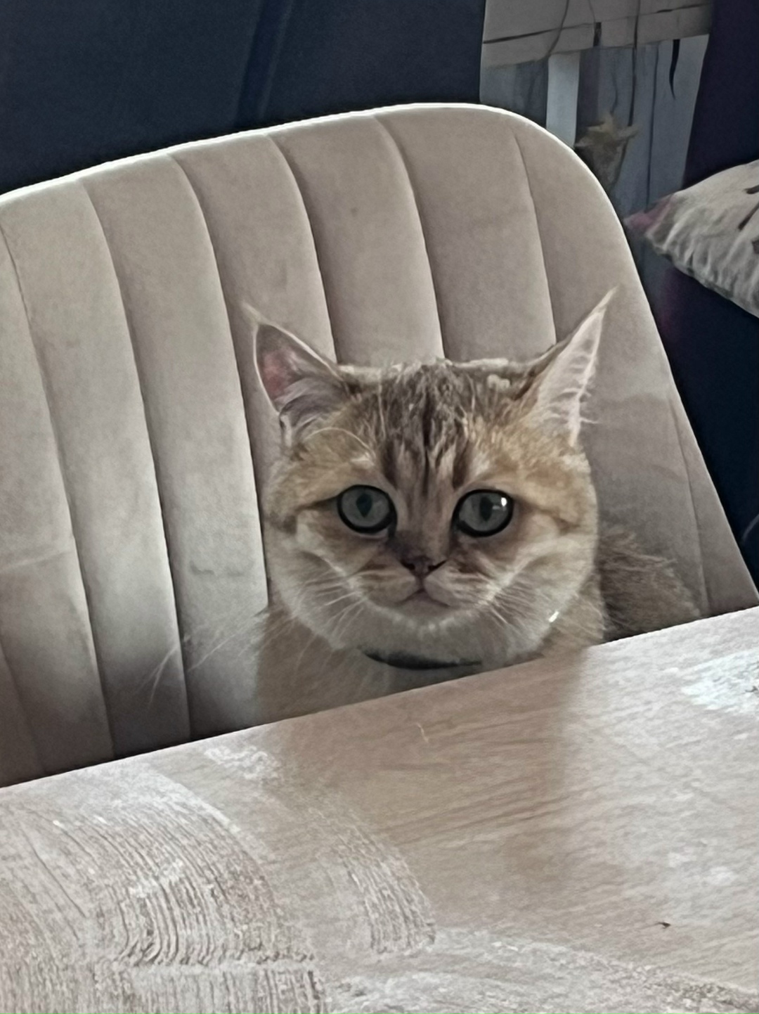 Золотистая шиншилла пепельного окраса, убежала с участка. На ней был красный ошейник с гравировкой с номерами телефонов. Иногда у нее начинает торчать нижний зуб, плохо умеет умываться, часто скапливается грязь под носиком. На ушках длинные кисточки, рядом с длинными усами тоже иногда черные усики появляются. На кончике хвоста темные кольца.