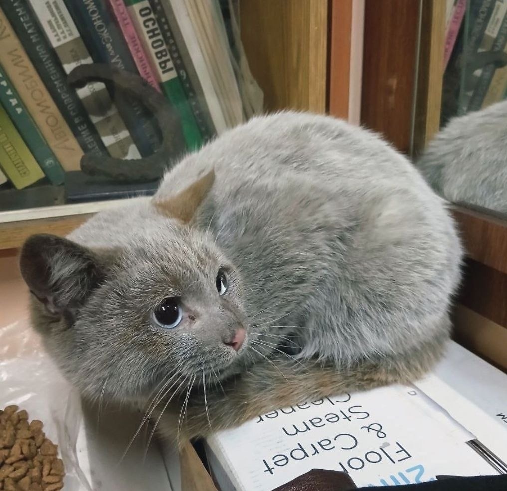 03.04. Сняли с дерева, куда загнали его собаки. Кот домашний, не местный, в диком стрессе, на всех шипит. Очень пыльный пока бегал по цеху, глаза голубые, подшерсток светлый. Глаза голубые, светло-серый, думаю. хвост в еле заметную рыжую полоску, на морде тоже угадываются рыжие полоски. Ушки тоже темнее. Как будто бы метис тайского