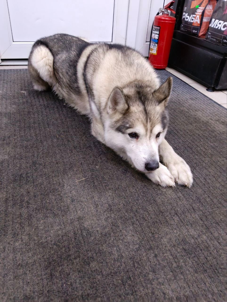 Фенотип хаски, молодой кобель без амуниции, прибился к магазину. Худой, уставший, от еды отказался. Лёг спать, как только оказался в магазине. Магазин скоро закрывается, куда потом его девать...