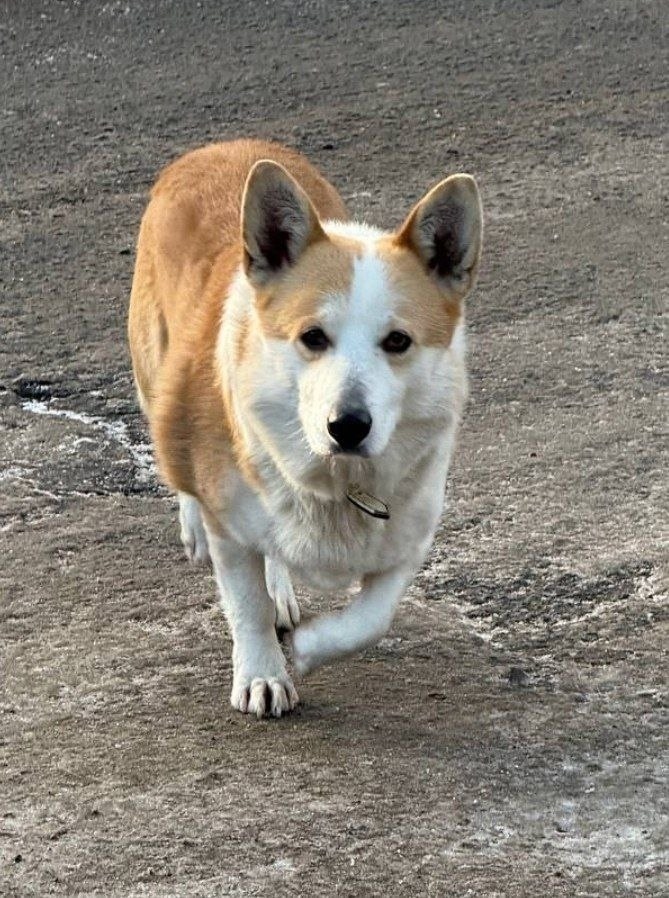 15.12. Кобель корги, окрас рыжий с белым, в ошейнике. Пол метис не известен, но держатся вместе.