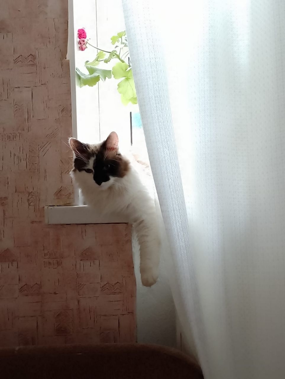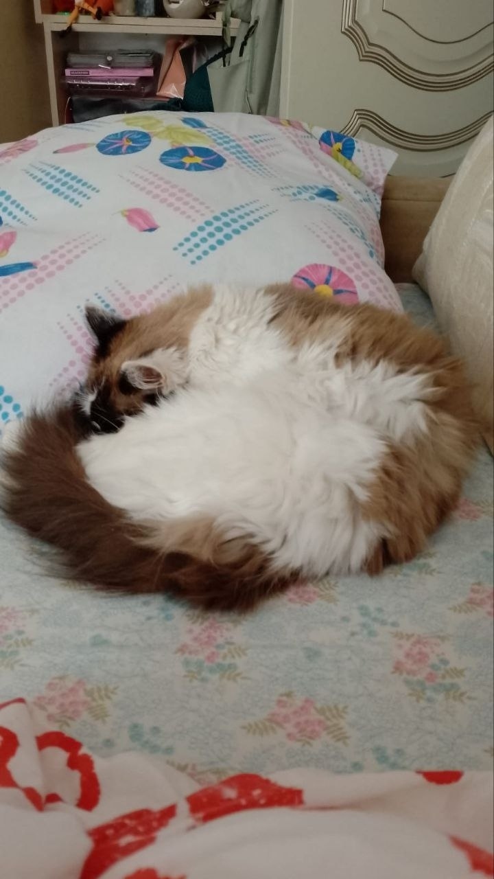Метис,рэгдолл.Отлкликается на "Снежок/Пушок".Вес 3 килограмма,маленький в росте,мальчик,голубые глаза,морда одна половина коричневая,почти чёрная,вторая белая,сам белый с коричнемым во всему тельцу.Ласковый,но только для своих,но в целом в руки даётся когда привыкает.