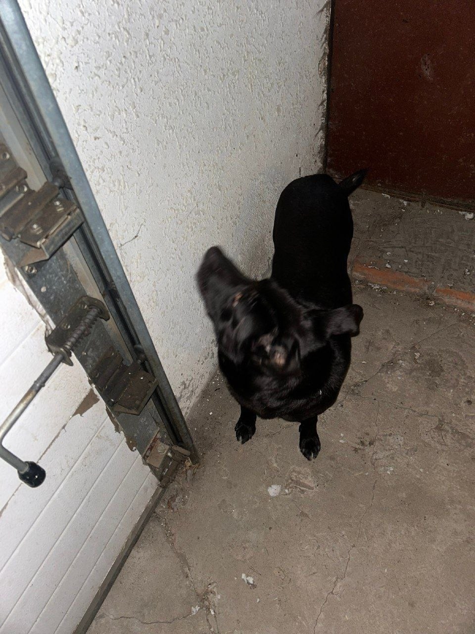 во время пробки вылетела собака из чьих-то ворот. Небольшого размера, окрас черный, терьеристого типа, мальчик. На шее ошейник. Придержан только до завтрашнего дня, больше нет возможности.