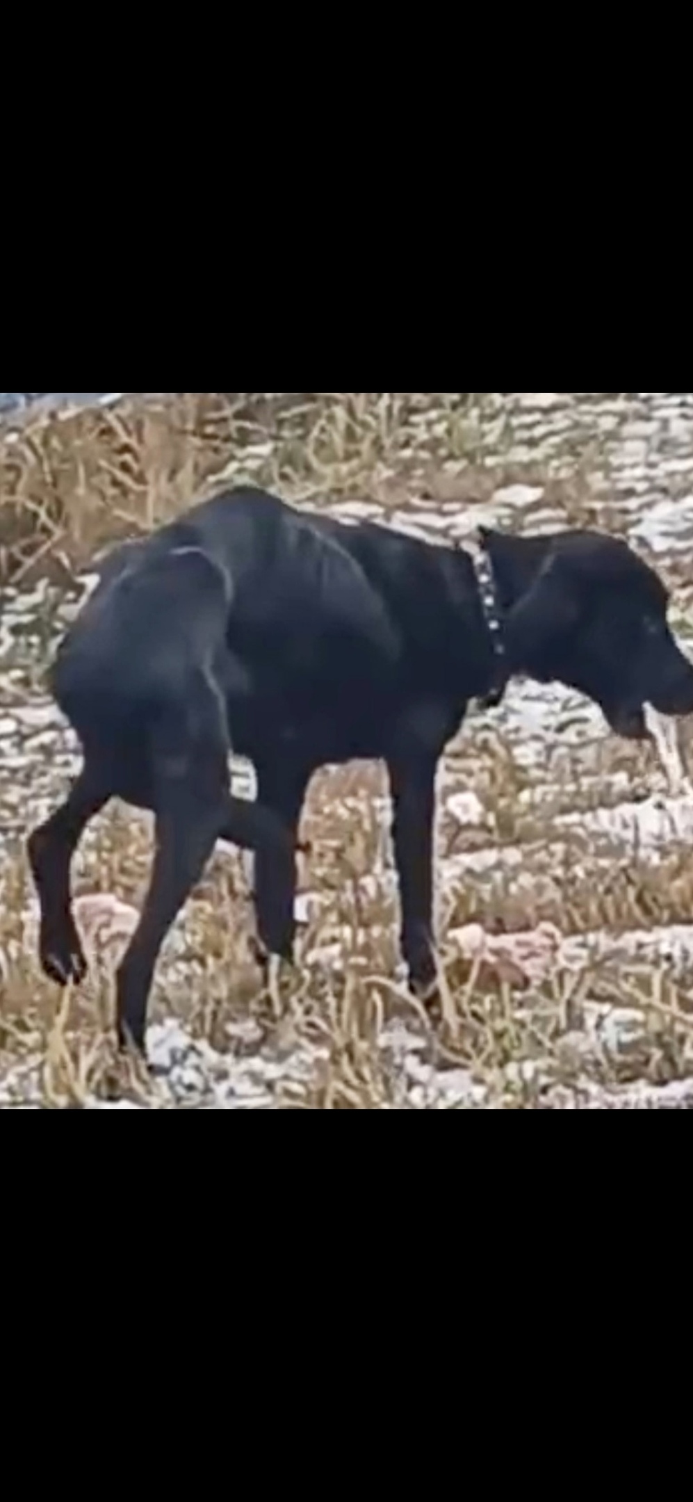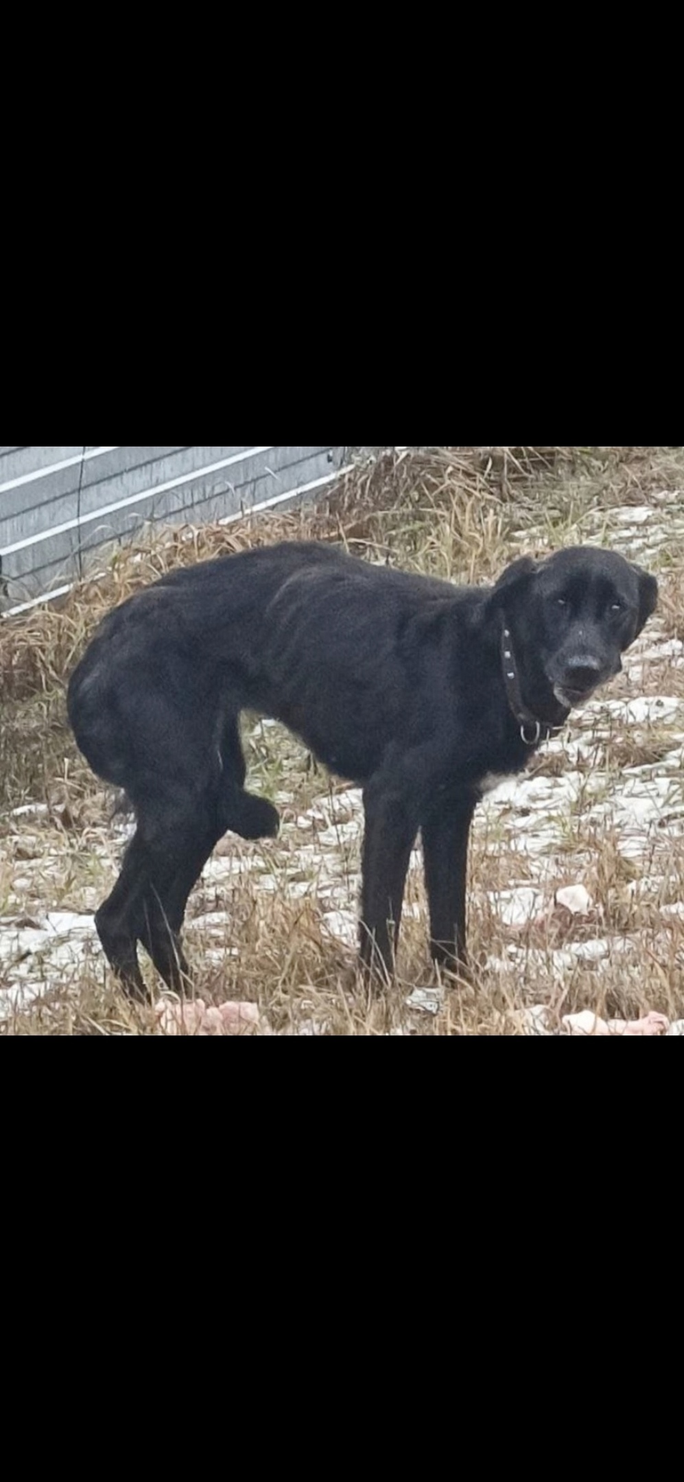 В кожаном ошейнике с металлическими клепками. Собака сильно истощена, в руки не даётся, придержать невозможно.