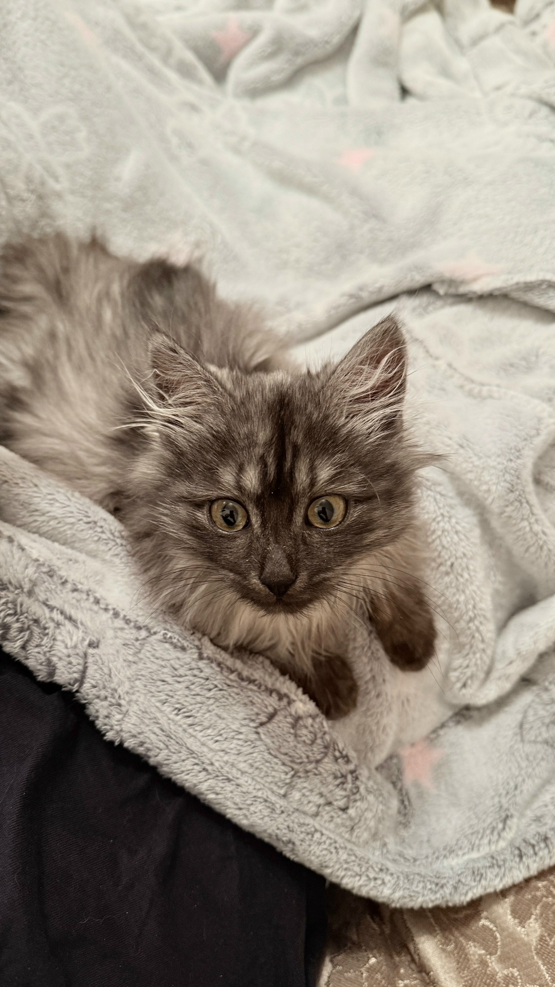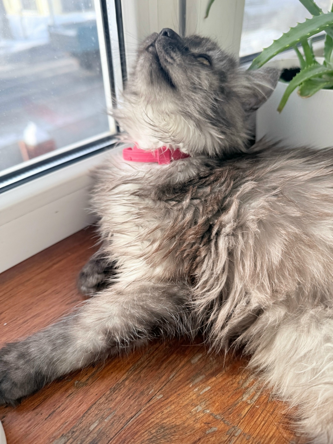 Котенок 6 месяцев, размер небольшой, на «кыс кыс» может не откликаться, окрас серый, янтарные глаза, розовый ошейник, самка.