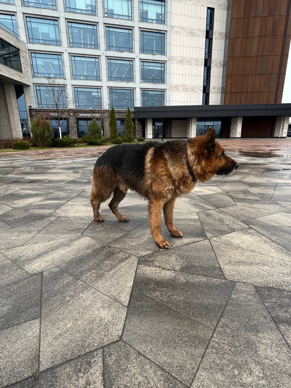 Кобель, 7-8 лет, седая морда, похож на немецкую овчарку, в темно-сером ошейнике