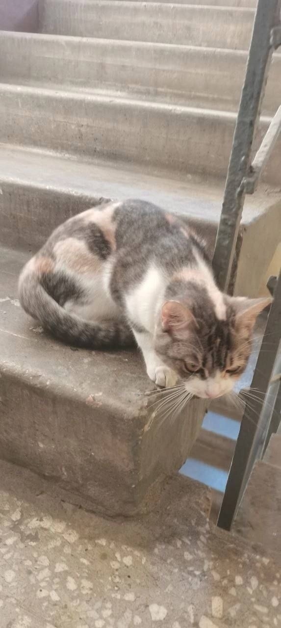Трехцветная кошка, как будто бы домашняя, чистая, ласковая