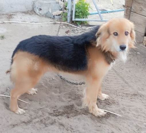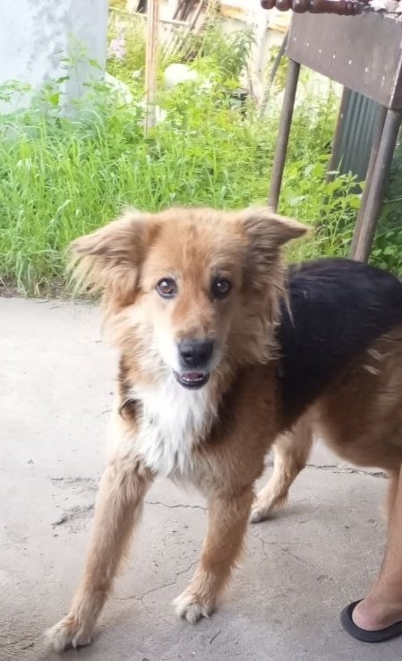 Зовут Дик, 13 лет, среднего размера, по колено, черный с светло рыжим, черная спинка, светло рыжая голова, улыбающаяся мордочка, белая грудка и кончики лап, брезентовый ошейник. Вся сложность, что парень подслеповат и глуховат, но ещё активный, вряд ли к кому то подойдёт 😭