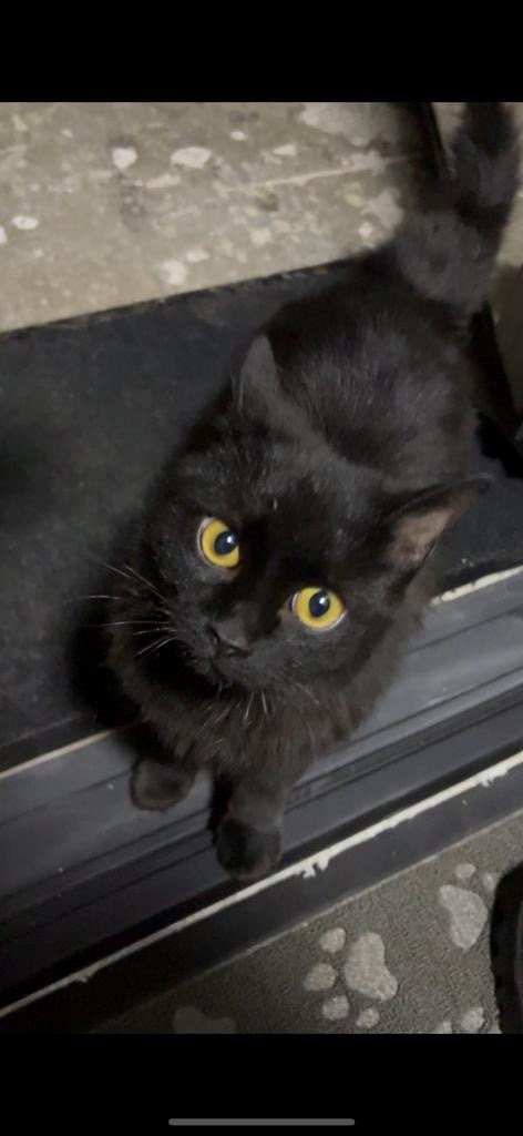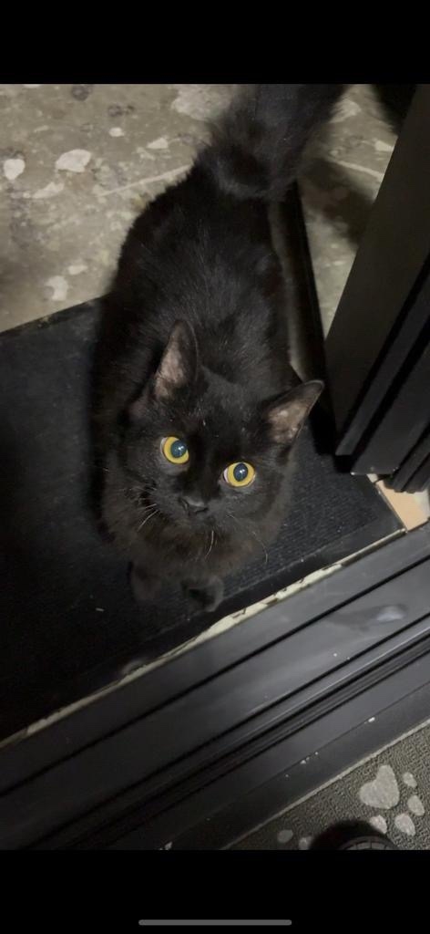 В районе Березовая роща в подъезде сидит черный кот (или кошка)