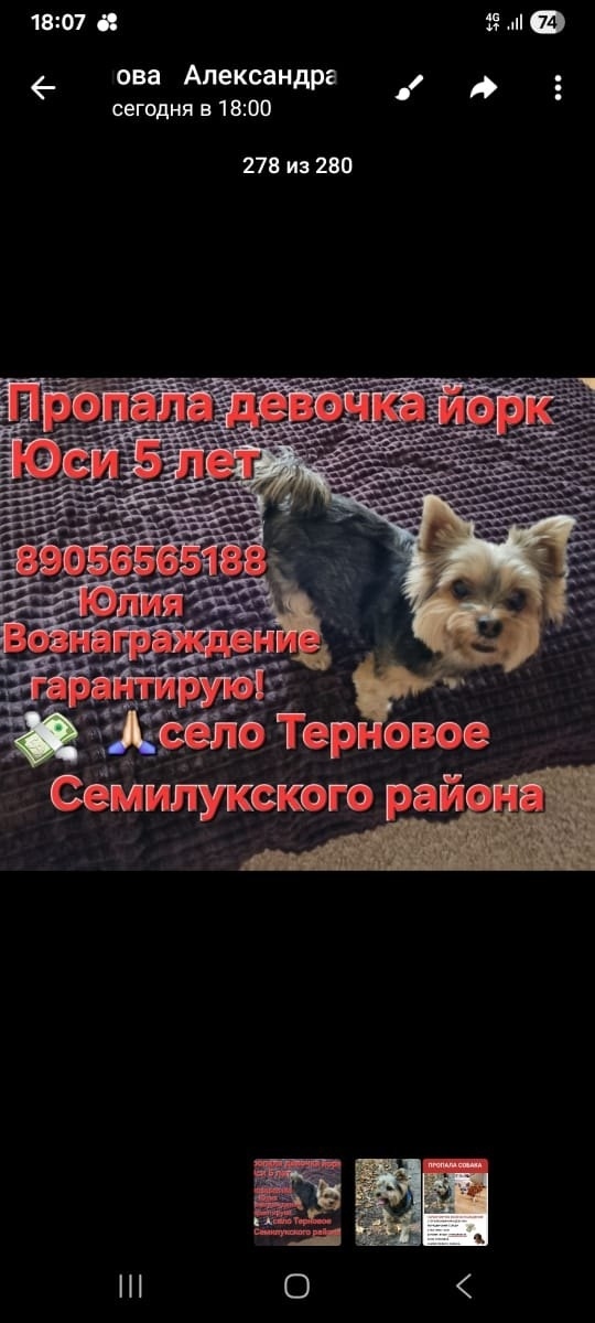 Пропала йоркширский терьер девочка с.Терновое Семилукского р-на. Собака дружелюбная, просьба вернуть за вознаграждение, ребенок очень ждет и скучает +79056565188