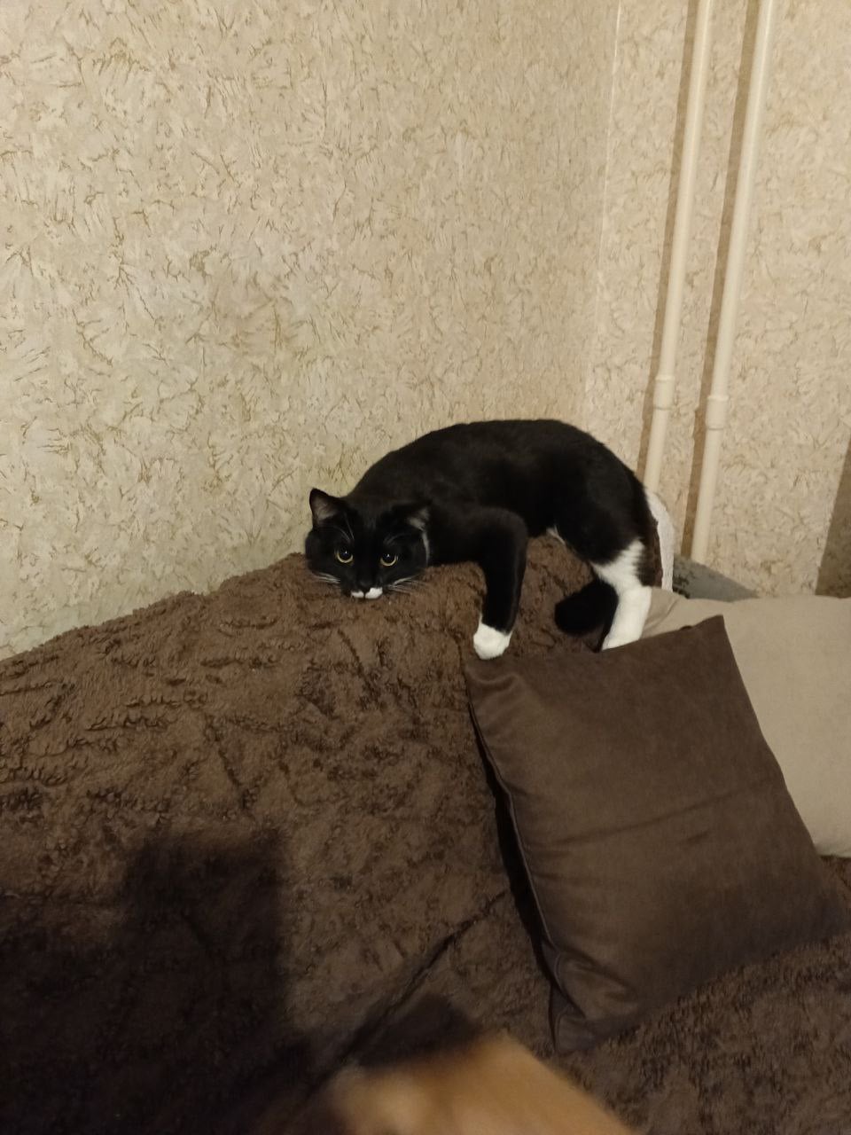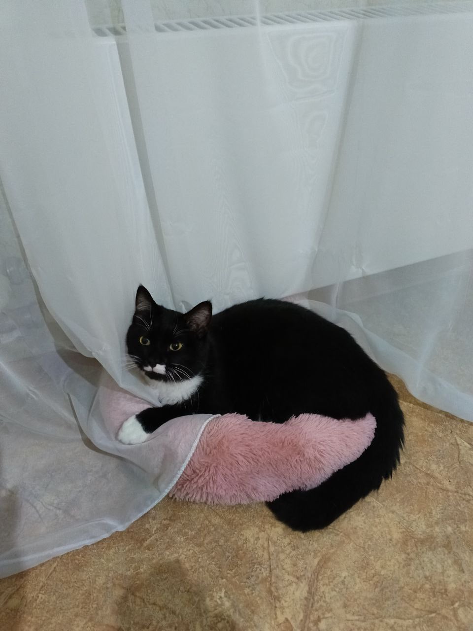 Окрас смешной, похож на грузина. Кот очень обаятельный, шерстка блестит, вальяжный, глазки очень красивые. Можно в семью с любыми другими животными, хорошо относится к котам и не боится собак.