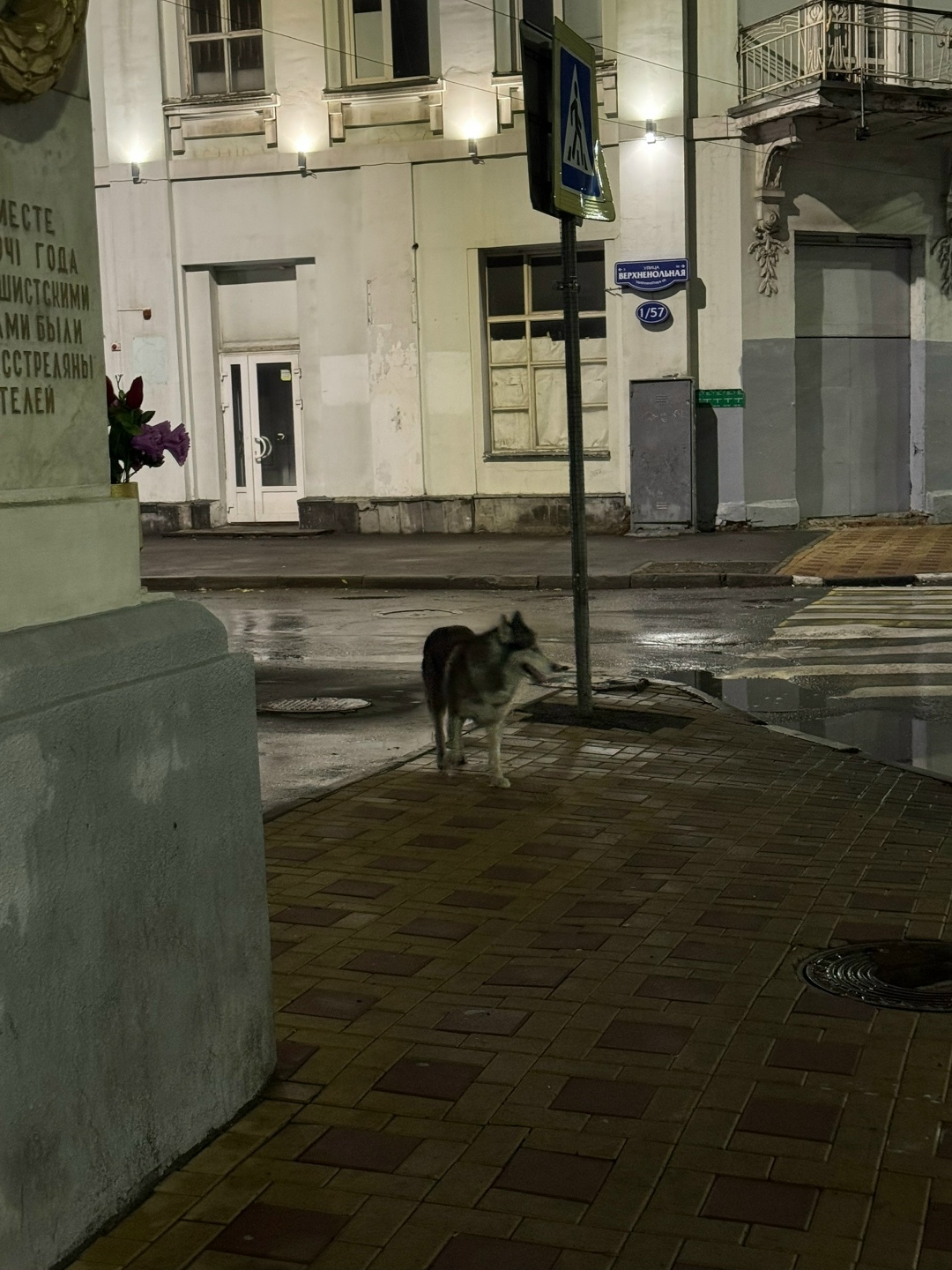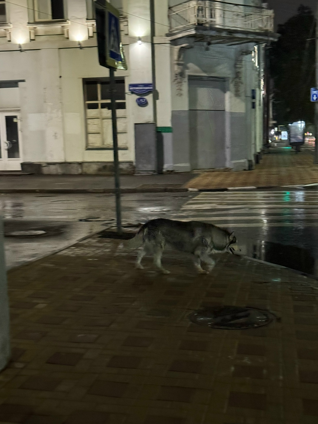 Встретили собаку на Советской улице( Ростов - на - Дону) примерно в 22:30, подходит близко, но трогать не дает, активно кого - то ищет. Убежал вниз по нижненольной улице. Крупный мальчик(не уверены), очень высокий в холке