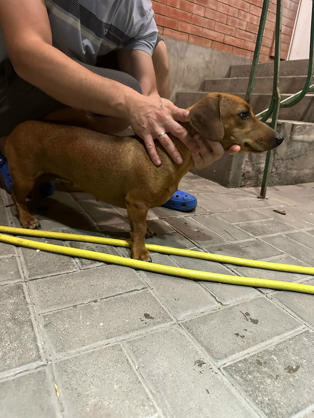 Порода такса, окрас рыжий, взрослая сука. Без ошейника, клейма и чипа.