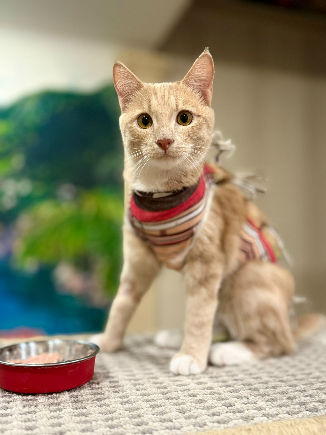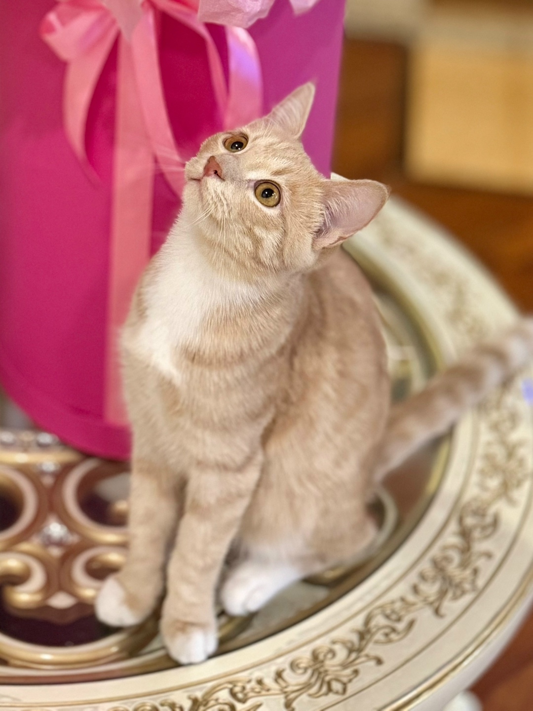 🐈 Окрас: персиковый с белой грудкой и лапками, пятнисто-полосатый, глаза — желто-песочного цвета.