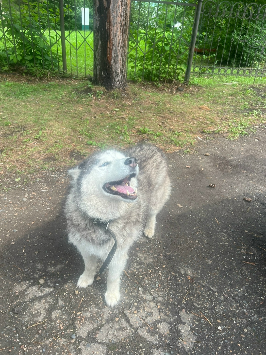 Приехали к ребенку в лагерь «Ласточка» , тут около забора хаски с ошейником прибилась , ни кто не знает чья . Предположительно девочка