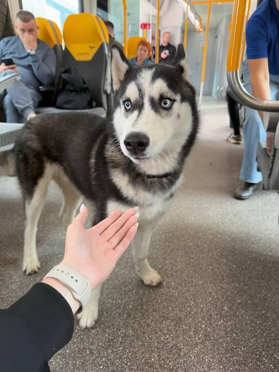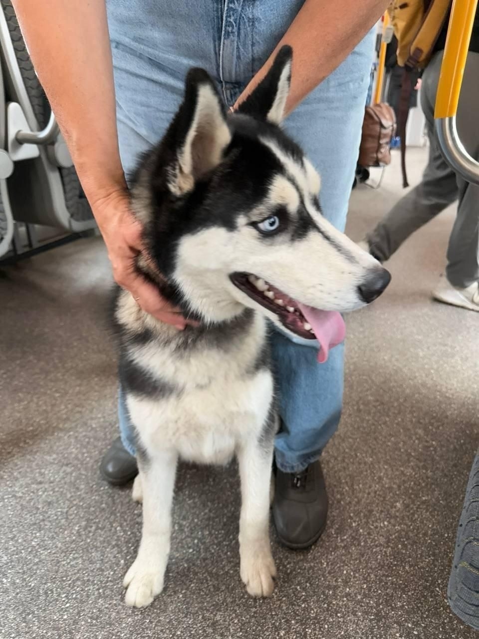 Кобель, глаза голубые. Был в ошейнике. Очень добрый и игривый.