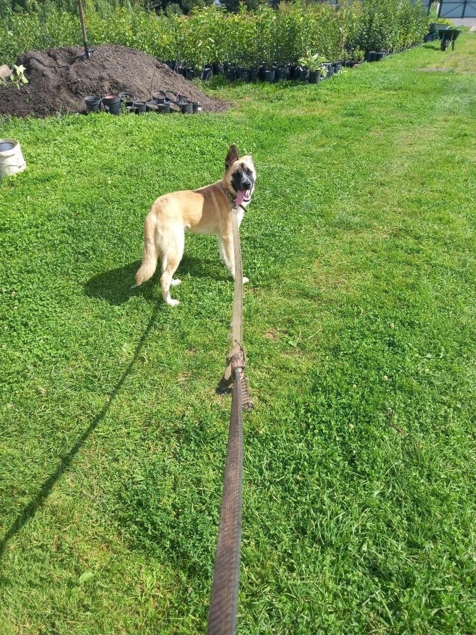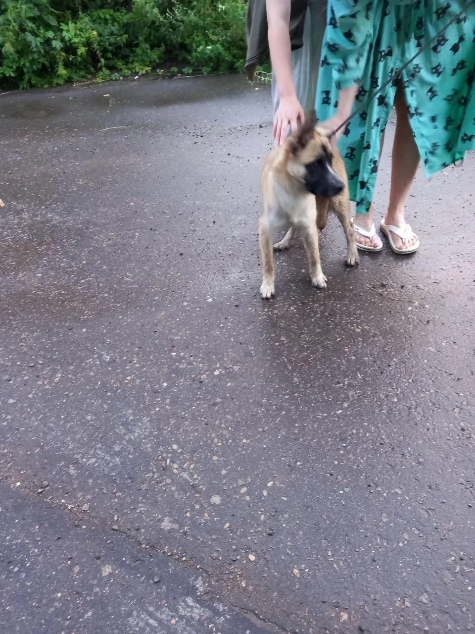 Найден щенок примерно 4-5 месяцев, кобель, с двумя ошейниками (один противоблошиный) и поводком, очень ласковый и ухоженный.Мордочка черная, сам бело-палевый.