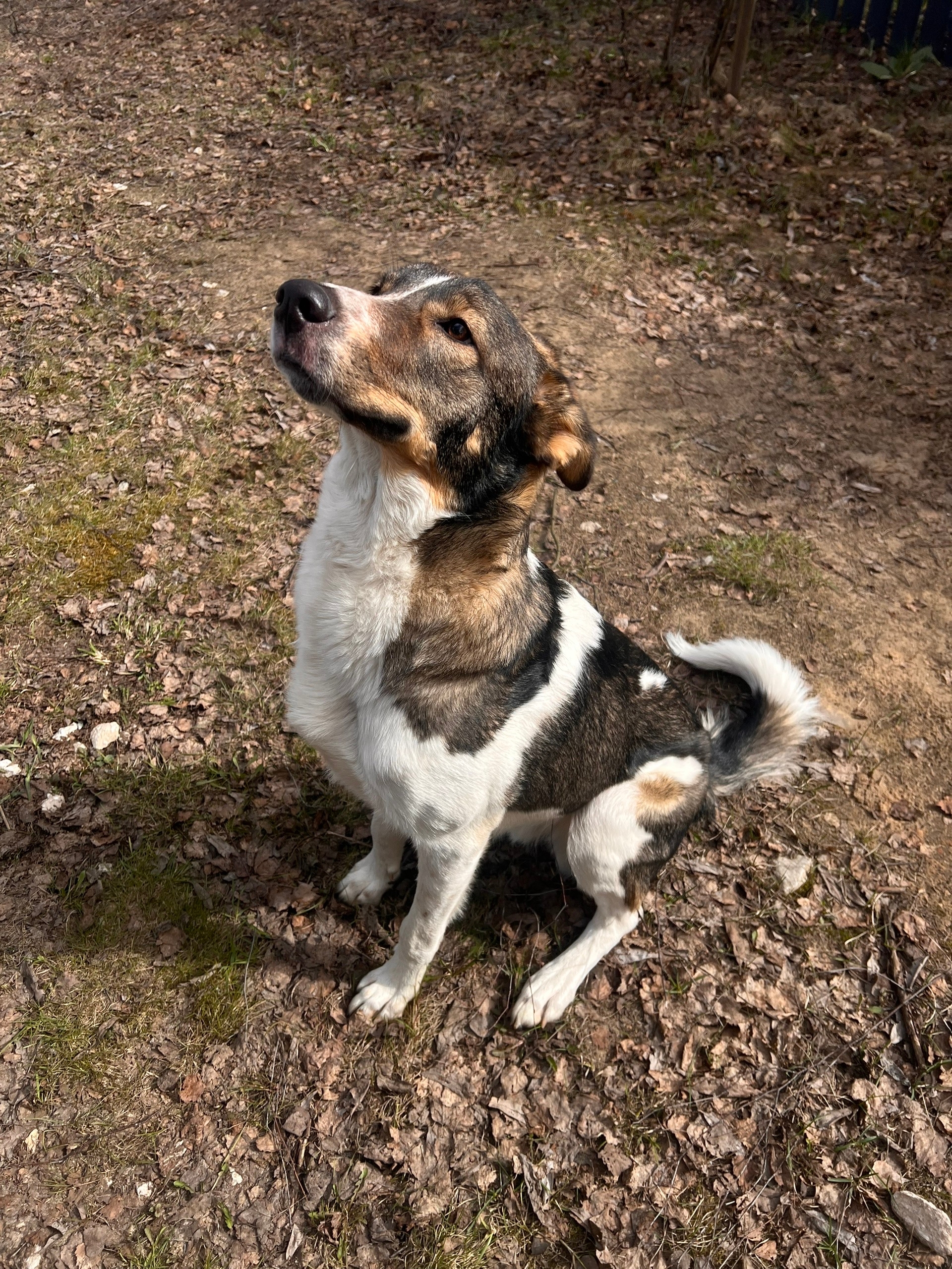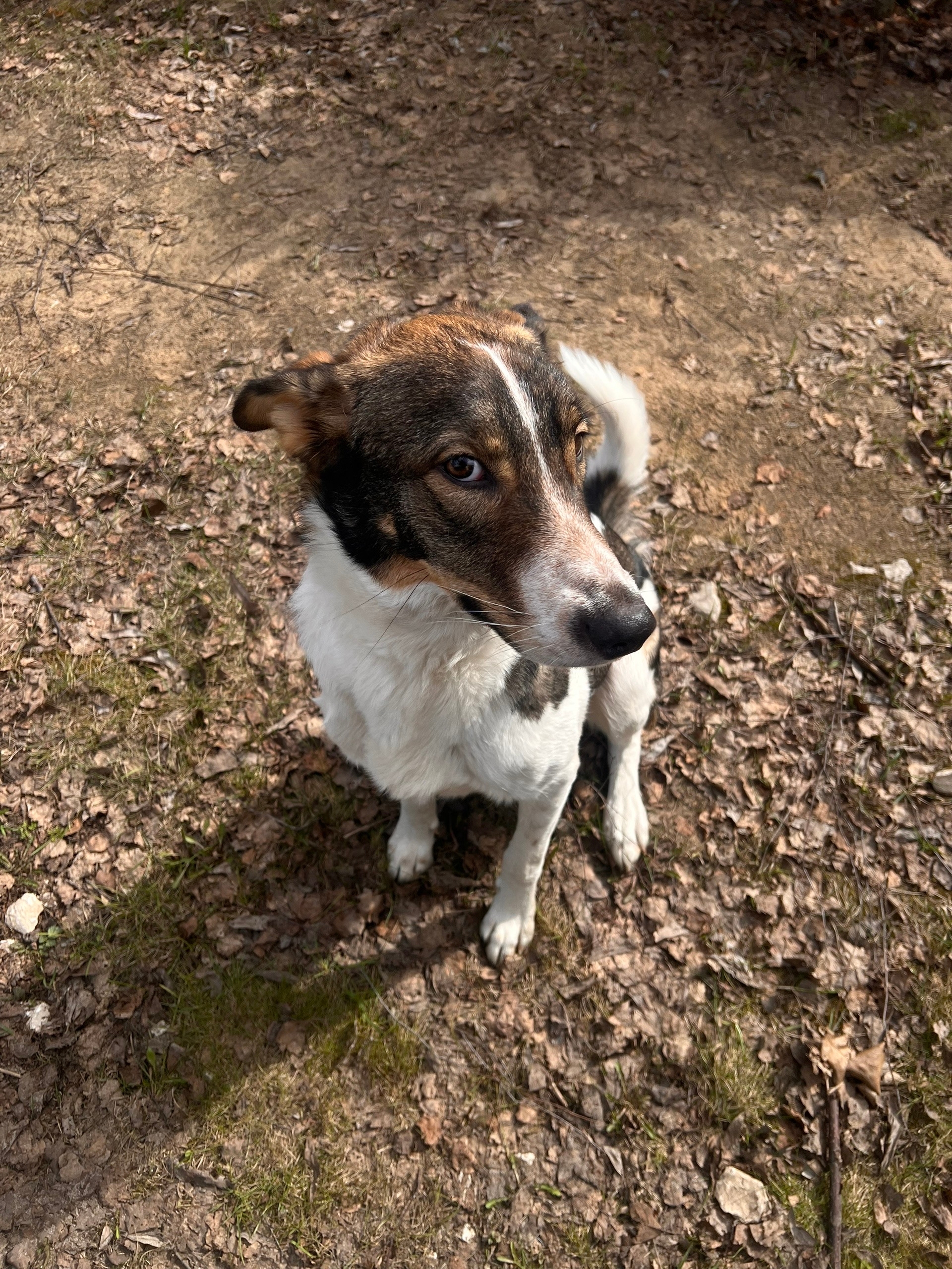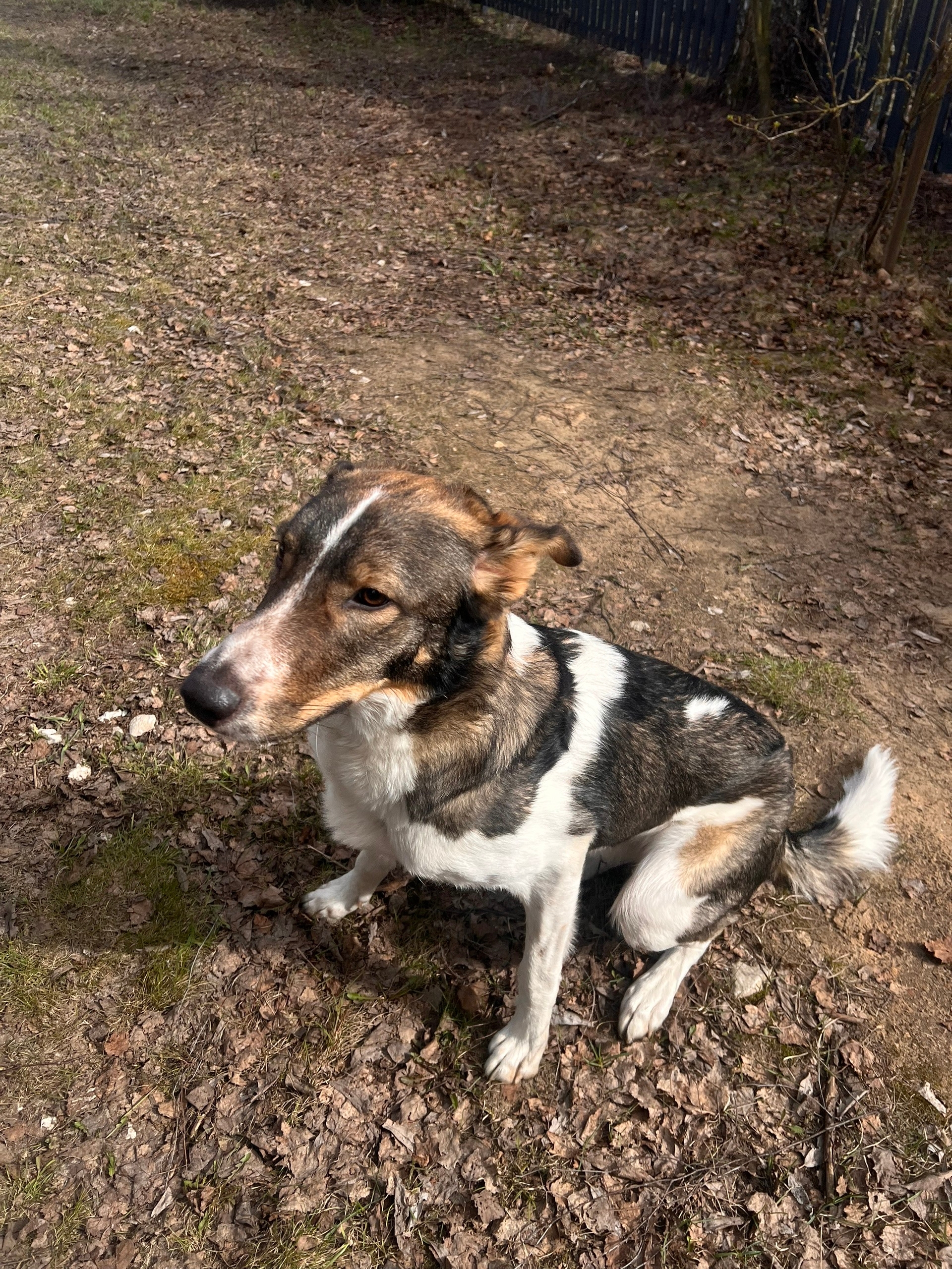 Найдена собака черно-белая. Кабель. Очень ласковый, добрый пёс. Домашний!