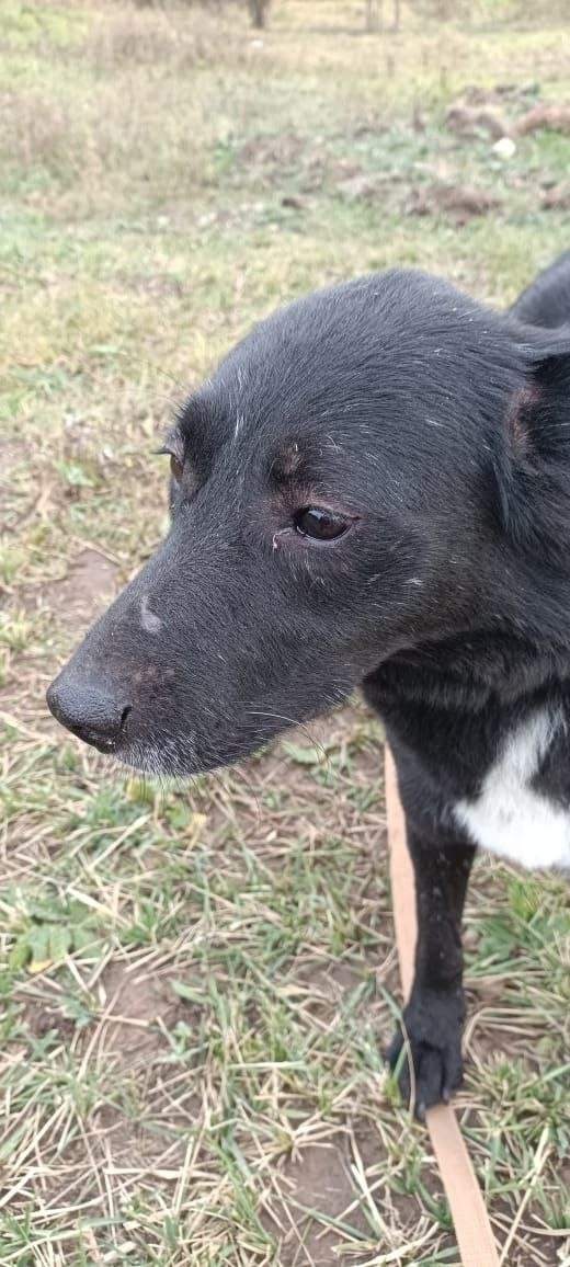 Девочка, полностью черный окрас с белым галстуком на груди, росту - по колено.