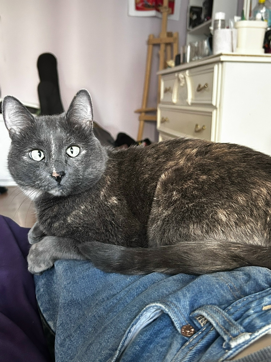 Приметы: серая с пятнышками, раскосые зеленые глаза