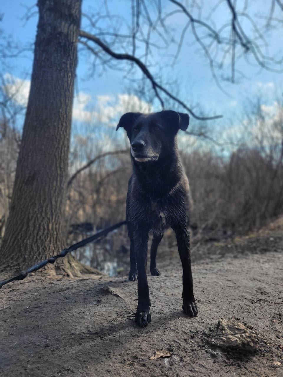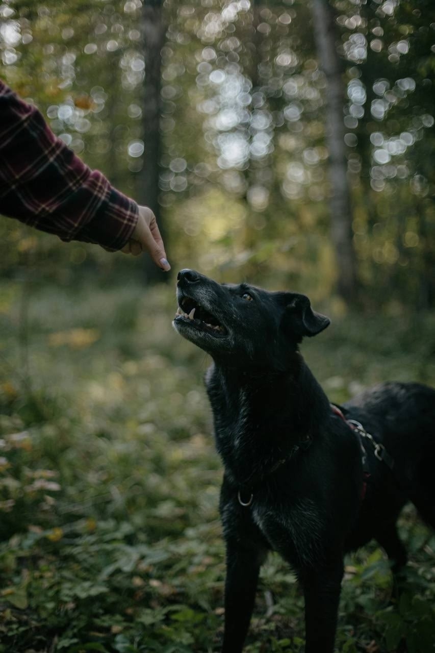 Крупная, чёрная с сединой, белый живот, карие глаза, на шее два светоотражающих адресника: желтый и оранжевый 🙏