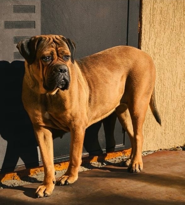 Собака породы кане-корсо коричневого цвета.
