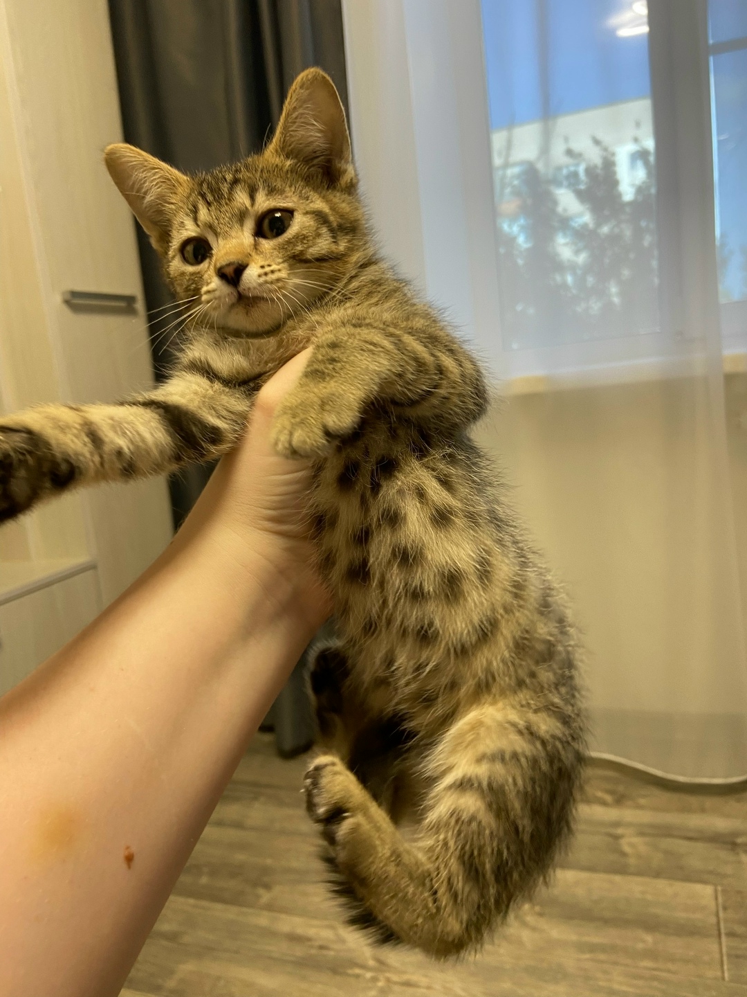Найден котенок. Мальчик, на вид 1-1,5 месяца. Сухой корм пока не ест, мокрый только. Всю ночь плакал под окном. Временно взяли к себе. Оставить не можем, тк уже есть коты и маленький ребенок. Пристраивается срочно.