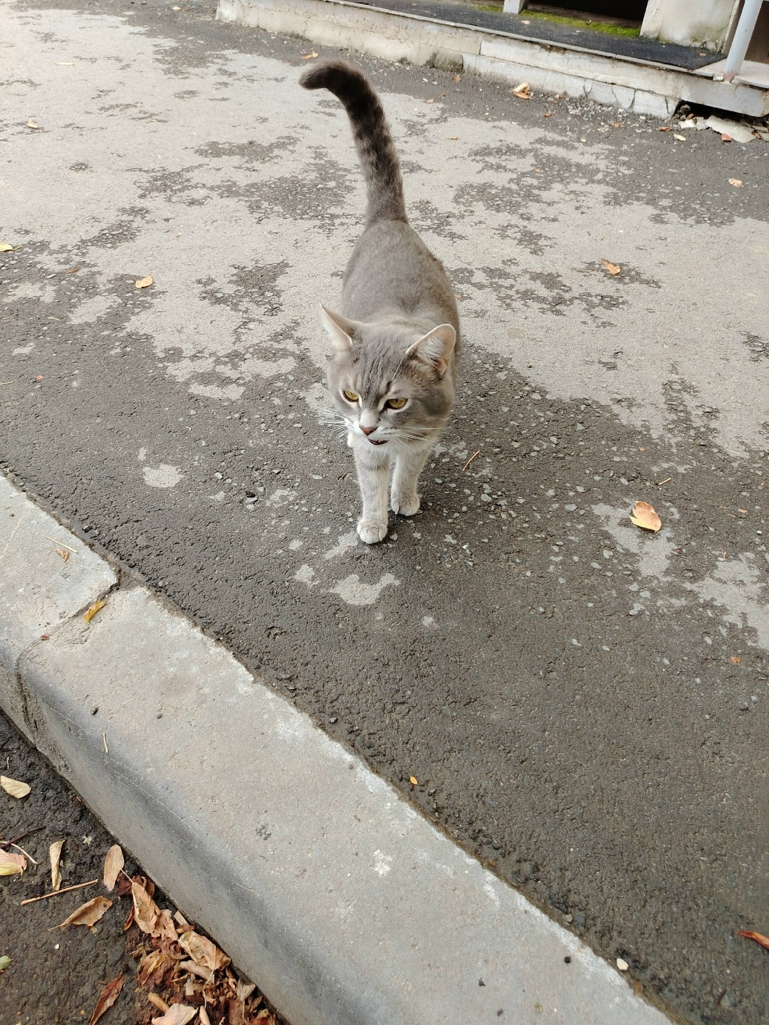 Прибился к офисному помещению по ул. Баррикадной 22, кот. Серого цвета, ухоженный, видно что домашний. По возрасту около года.