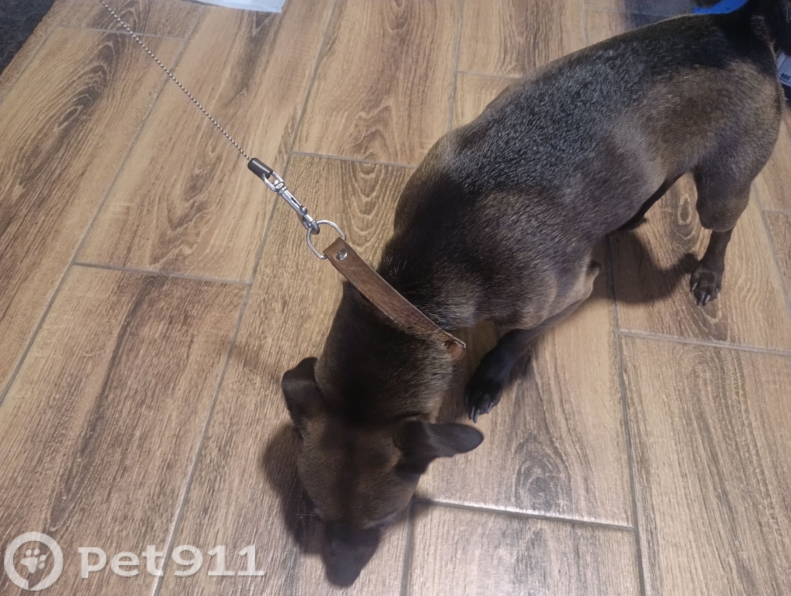 Найдена собака, тёмный окрас, чёрный/коричневый. Скулила на улице у нашего дома с поводком в Сайнаволоке (г.Петрозаводск) Ищем хозяина.