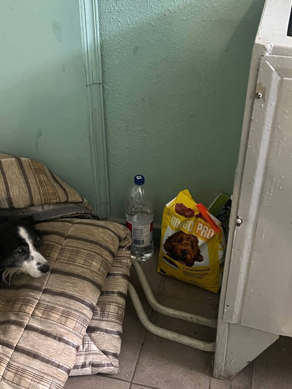 Собачка сейчас в подъезде, хотим вернуть ее домой . Очень добрые глаза, жутко испугана! на ней розоватый ошейник.Черная собака, в холке где-то 30 см, морда и лапы белые, морда немного седая, шерсть на спине как после линьки