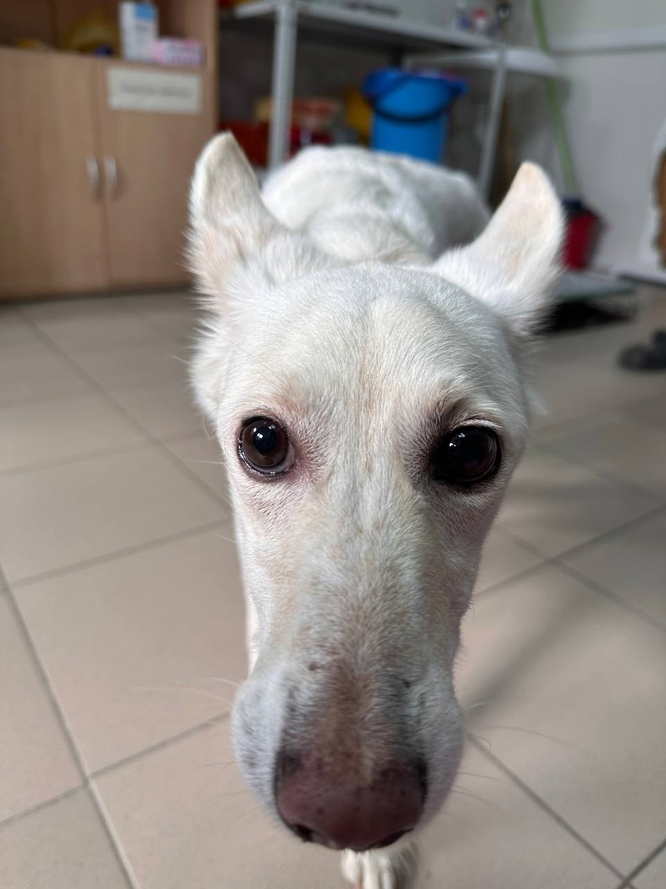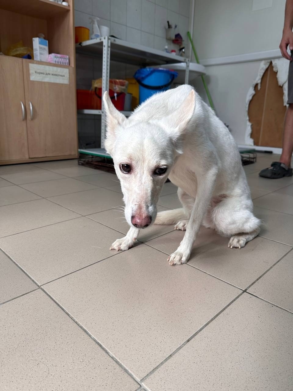 Найдена собака, девочка белого окраса. Метис. Примерно 5-6 лет очень пугливая, бросалась под машины, людей боится. Совсем маленького размера, 10кг.