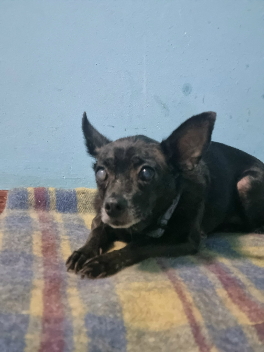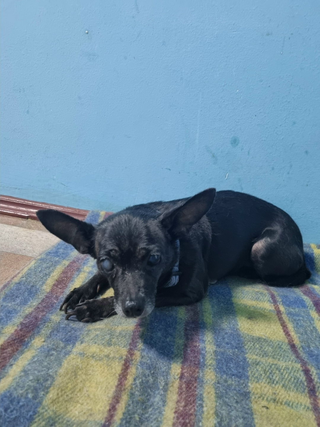 Собака не большая, черного цвета. Один глазик с бельмом. Очень напугана и дрожит