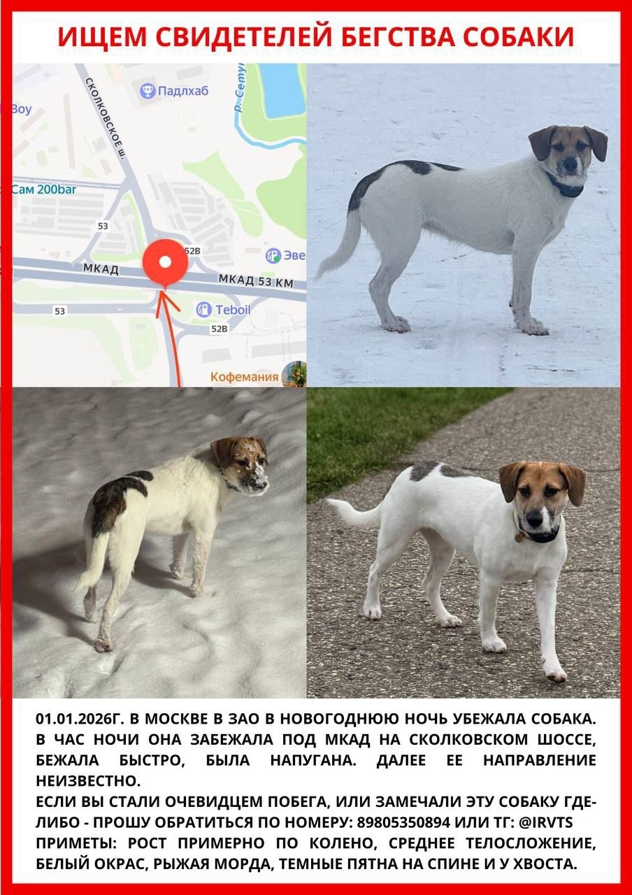 В ночь на 1 января 2026 года около 01:00 Лиса попала на камеру на Сколковском шоссе под МКАДом. После этого следы теряются. Это единственная зацепка!