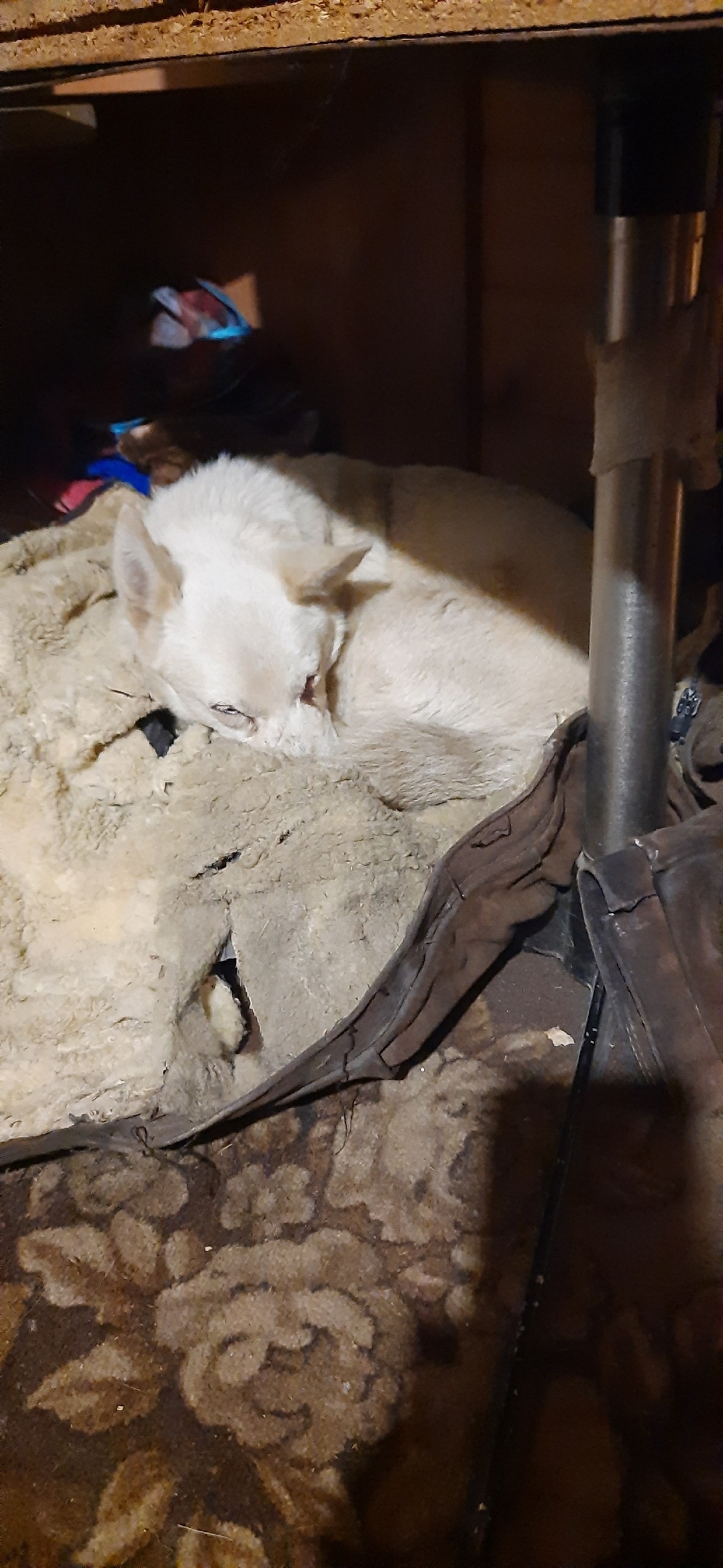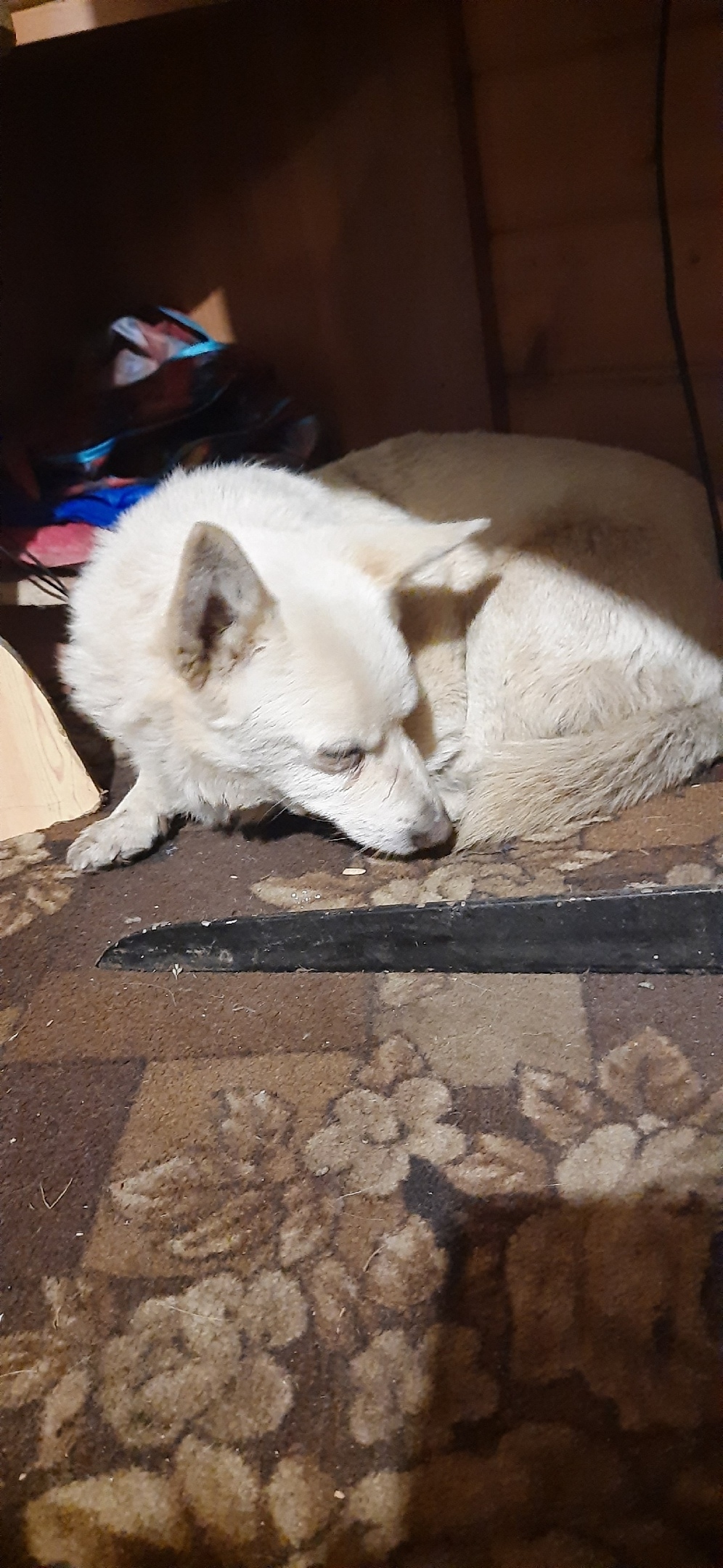 Белый пёс, кобель, вес 6-9 кг, без ошейника. Сидел на обочине дороги рядом с деревней Васютино, потом ходил по снт Электропередача 2 (Павлово-Посадский район). Отвела домой, накормила, напоила.