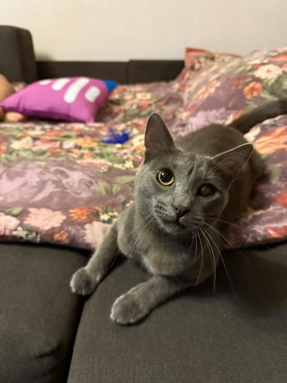 Особые приметы: Серый окрас, глаза жёлтые, левый глаз немного мутный.