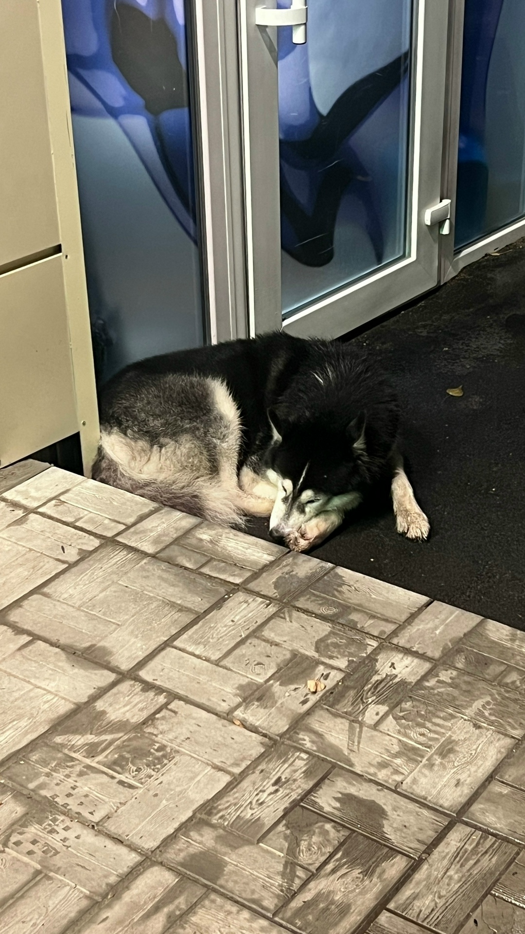 Возле магазина лежит хаски, видимо потерялся или убежал, видно что домашний и чистенький, но из за погодных условий испачкался лежит на грязном коврике. Ошейника не было. Хозяин найдись!
