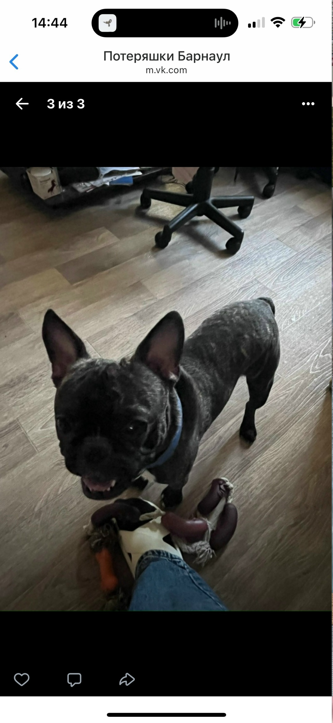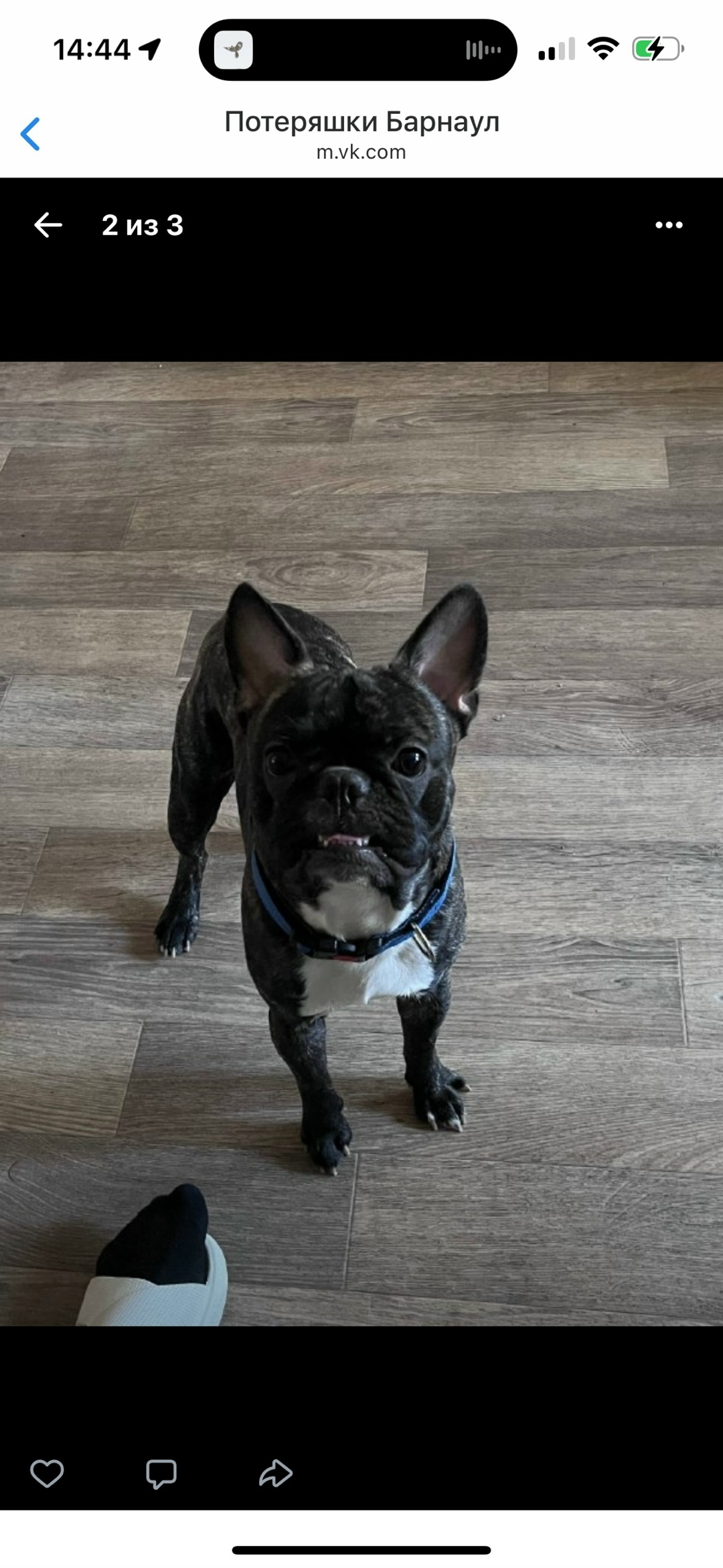 Потерялся Французский бульдог. 23.10.2025 приблизительно в 16:00 в районе Красноармейский-Анатолия. Молодой самец в синем ошейнике. Вознаграждение!!! 89520013106