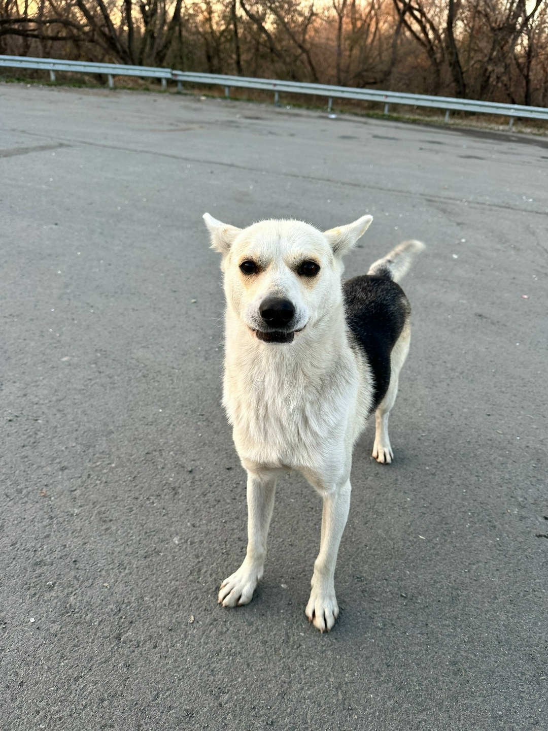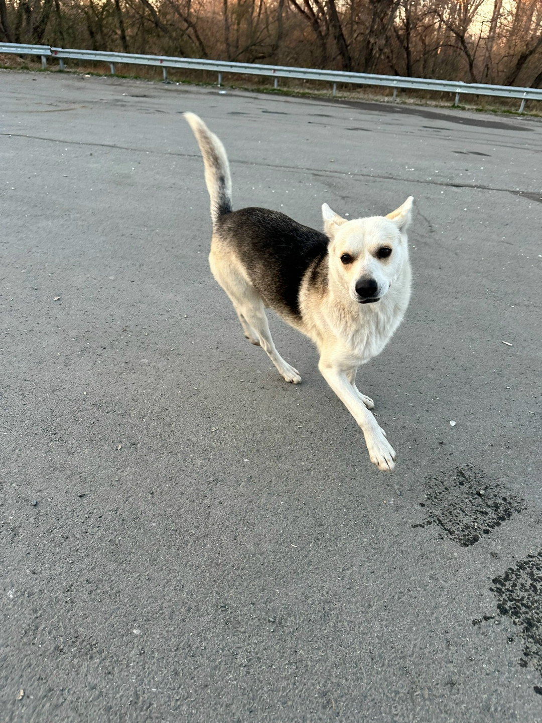 Живёт на трассе, вероятнее всего выкинули . Осторожный , но не агрессивный, к рукам подходит, играет .