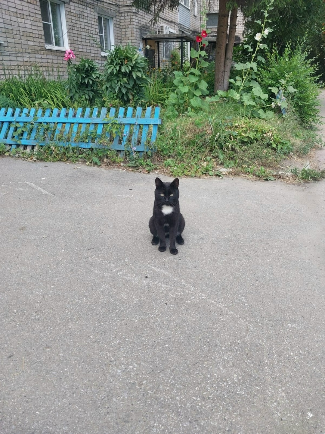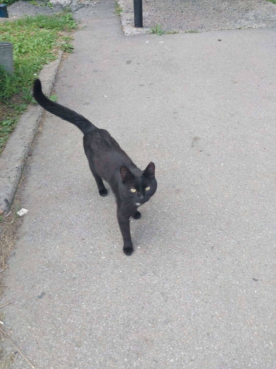 Подбросили во двор молодого чёрного котика, белое пятнышко на груди, ко всем ластится, трется о ноги, просится домой, выживает на улице больше месяца.