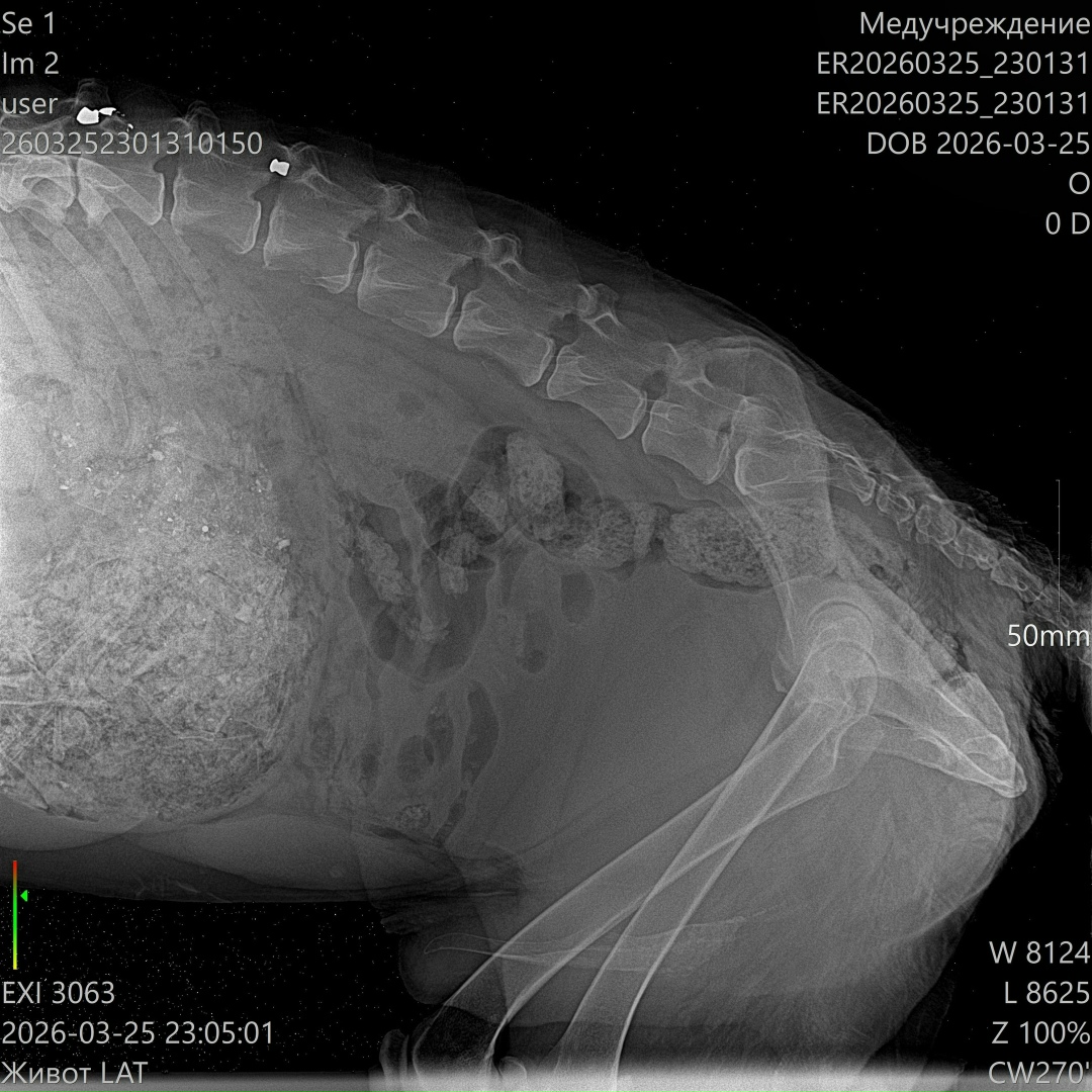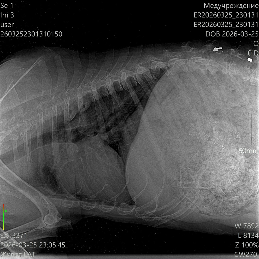 Сейчас он в клинике в тяжёлом состоянии: высокая температура, сильно повышены лейкоциты. По УЗИ свободной жидкости нет, но в желудке — куча костей… и самое страшное — пуля в позвоночнике 😭