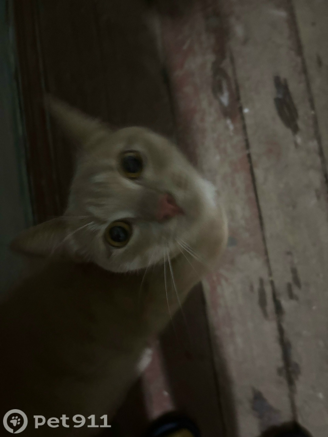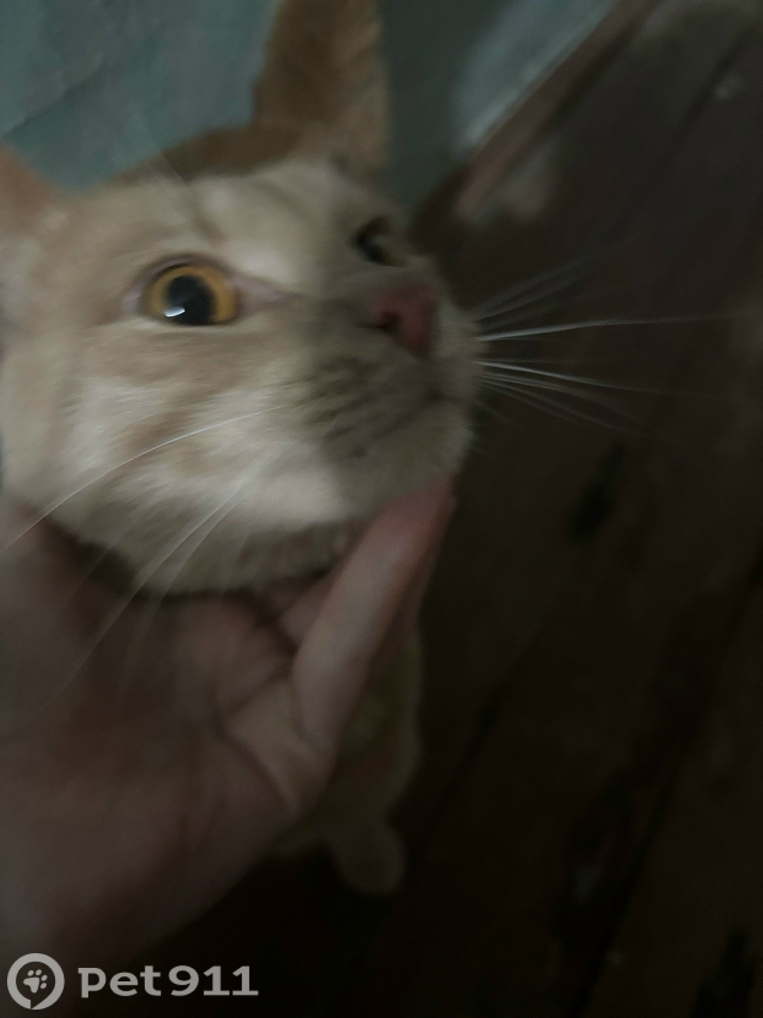 Рыжий с зеленым ошейником. Пугливый. Сидит в подьезде.