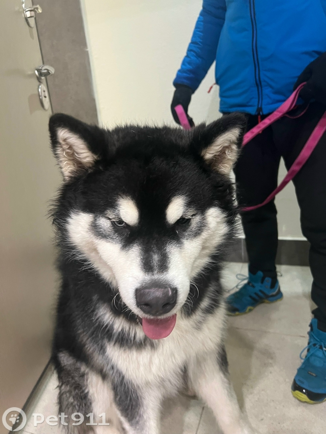 Мальчик,похож на маламута. Глаза разные. Очень контактный,видно что молодой. Красный ошейник.