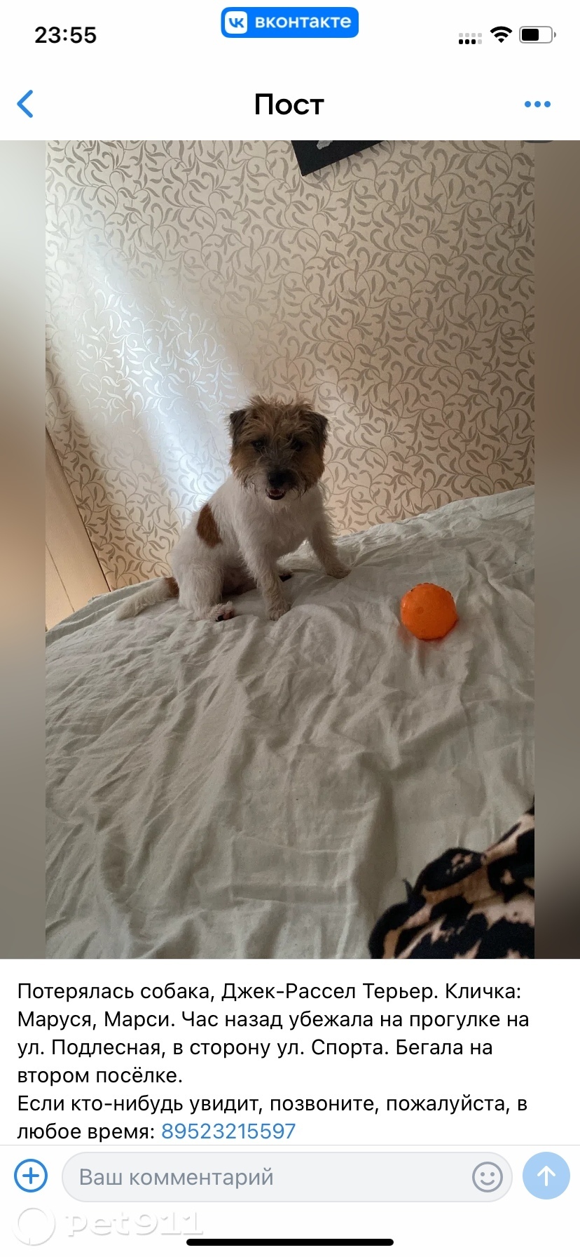 Убежала во время прогулки. Белая, с рыжими пятнышками. Стерилизована.