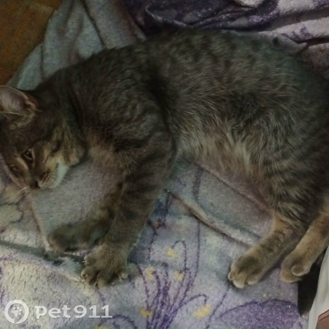 Полосатый, с зелеными грустными глазами, сероватый оттенок с белой мордочкой и светлыми пятнышками.