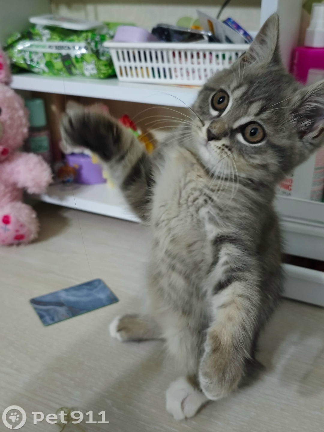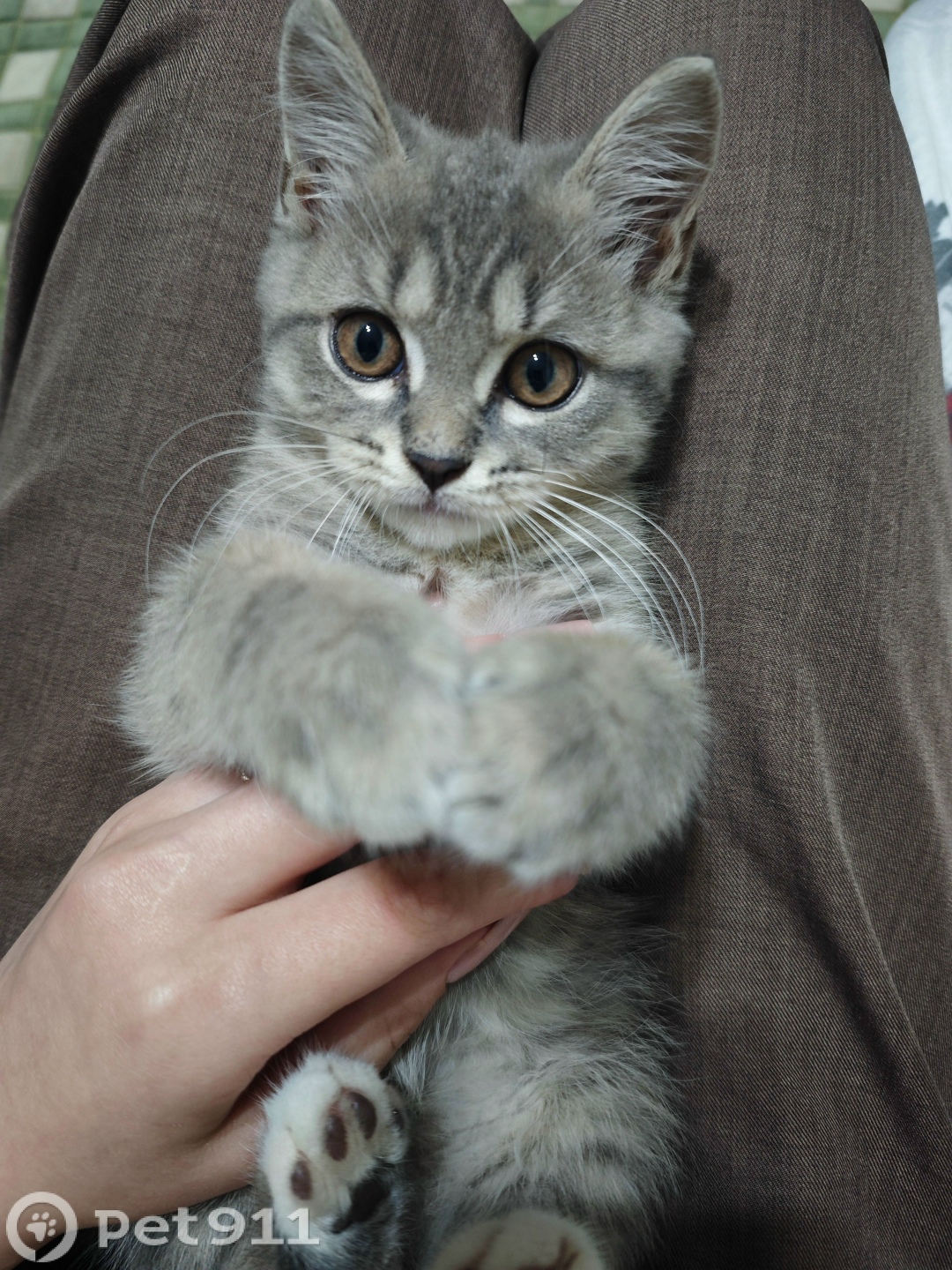 Котик серого окраса, на носу имеется небольшой беленький "шрамик". Активный, любвеобильный, ему месяца 2 - 3