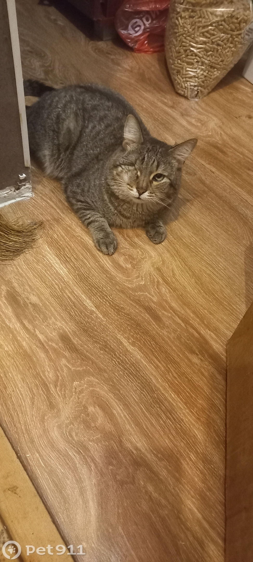 Окрас черно-серый, очень спокойный кот, боится незнакомых, одного глаза нет ( вырезан). Выбежал из окна.