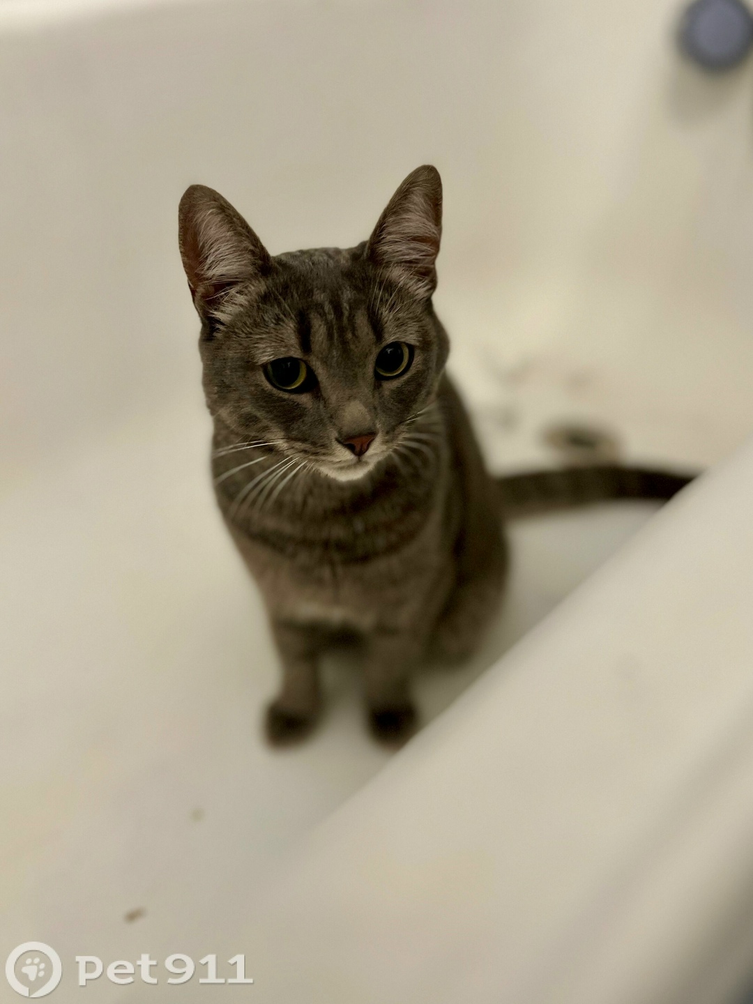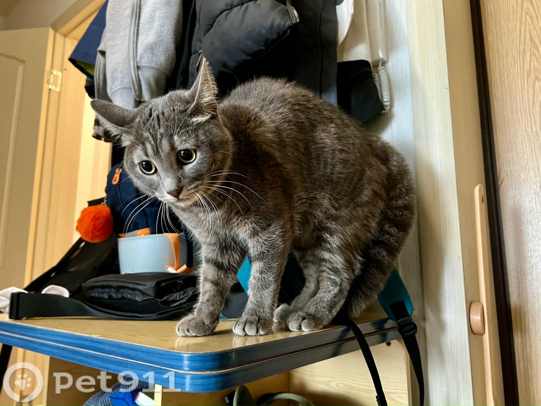 Зверь серого цвета с серыми полосками. Пол пока не смотрели, чтобы лишний раз не хватать. Нашли на газоне у дома 45 на ул. М. Петрова. Был очень напуган и жалобно мяукал. Ждём хозяев! Видно, что кошка домашняя: не грязная, чистые уши, ориентируется в квартире.