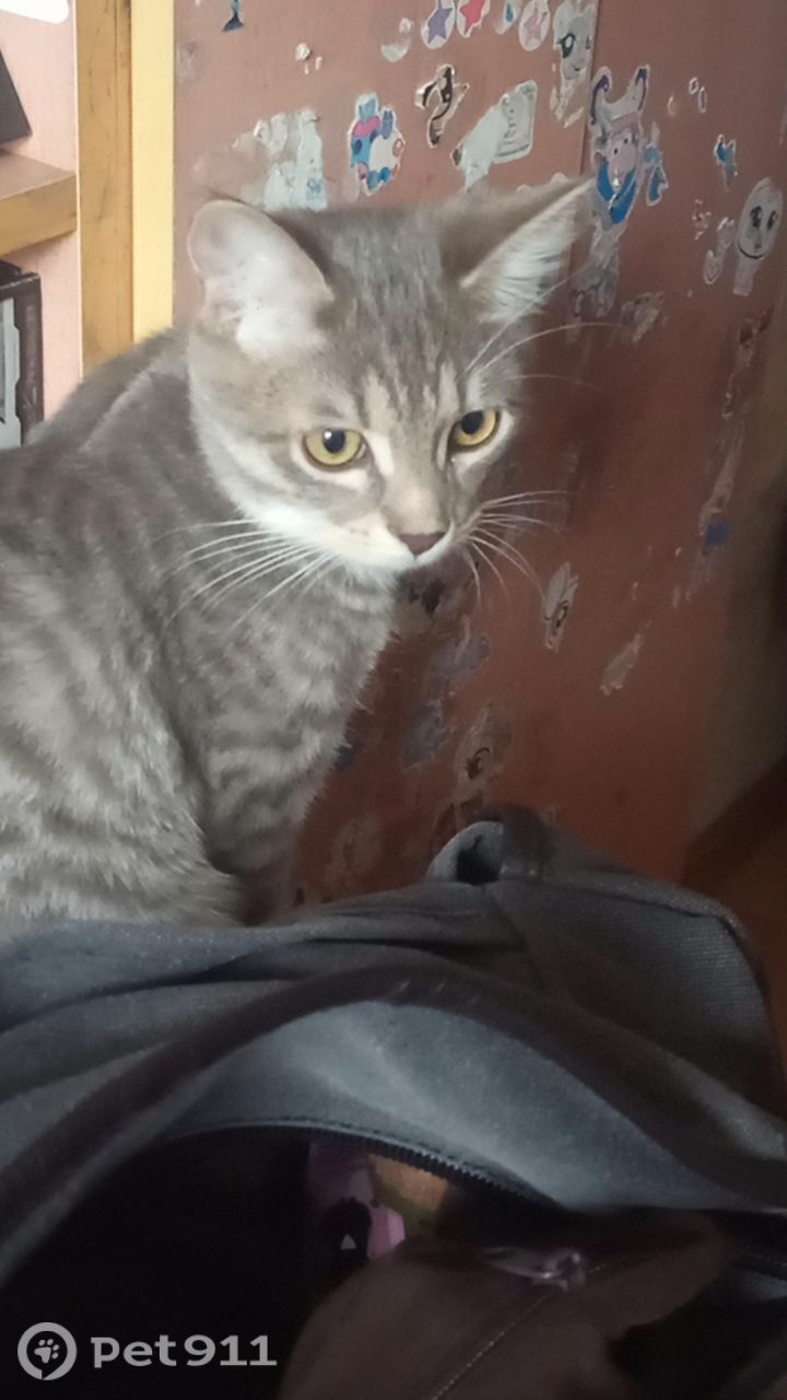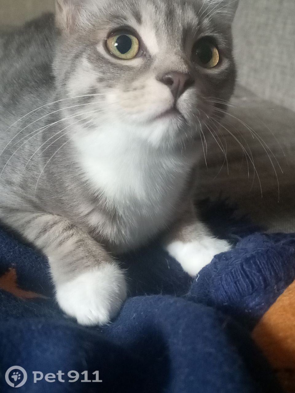 Окрас: Метис, серого цвета, полосатый. Грудинка белого окраса. На передних лапках белый окрас в виде носочков. На задних лапках белый окрас в виде гольфиков. Подушечки на лапках розовые. Сам кот короткошерстный,но сейчас скорее всего в полушубке,так как зима на улице. Возможно местами на шерстке мог проявиться персиковый оттенок, так у его брата близнеца данный цвет присутствует.